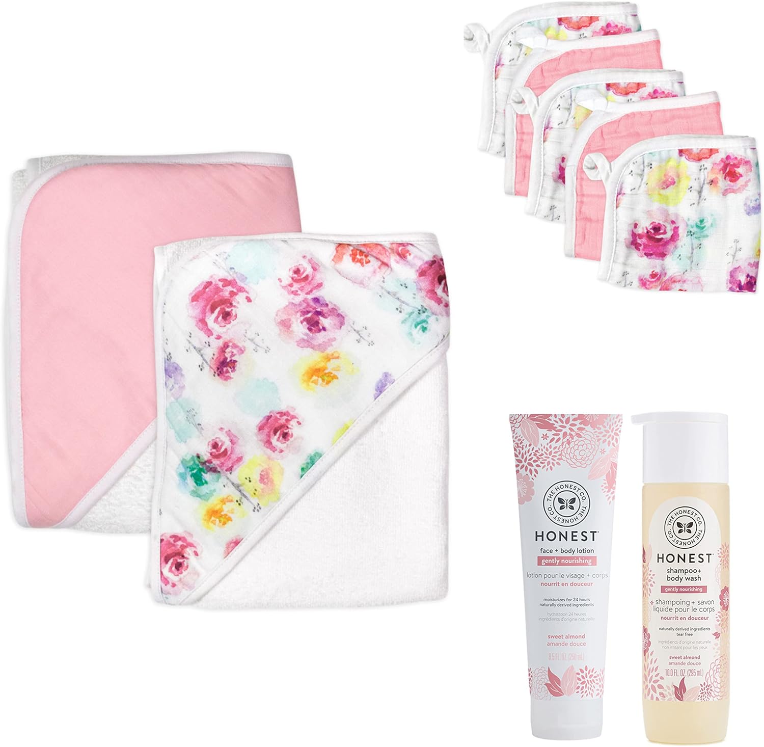This adorable 9-piece bath time set makes the perfect gift! Our extra plush hooded towels and washcloths are made from 100% organic cotton certified by GOTS and are must-have baby essentials that any mom would love. Our bath time gift set comes with two hooded towels and 5 washcloths with Honest body lotion and shampoo + body wash. We pack this cute set in a craft gift box with a colorful band. Does it get any easier to give a great gift? That’s a wrap!
