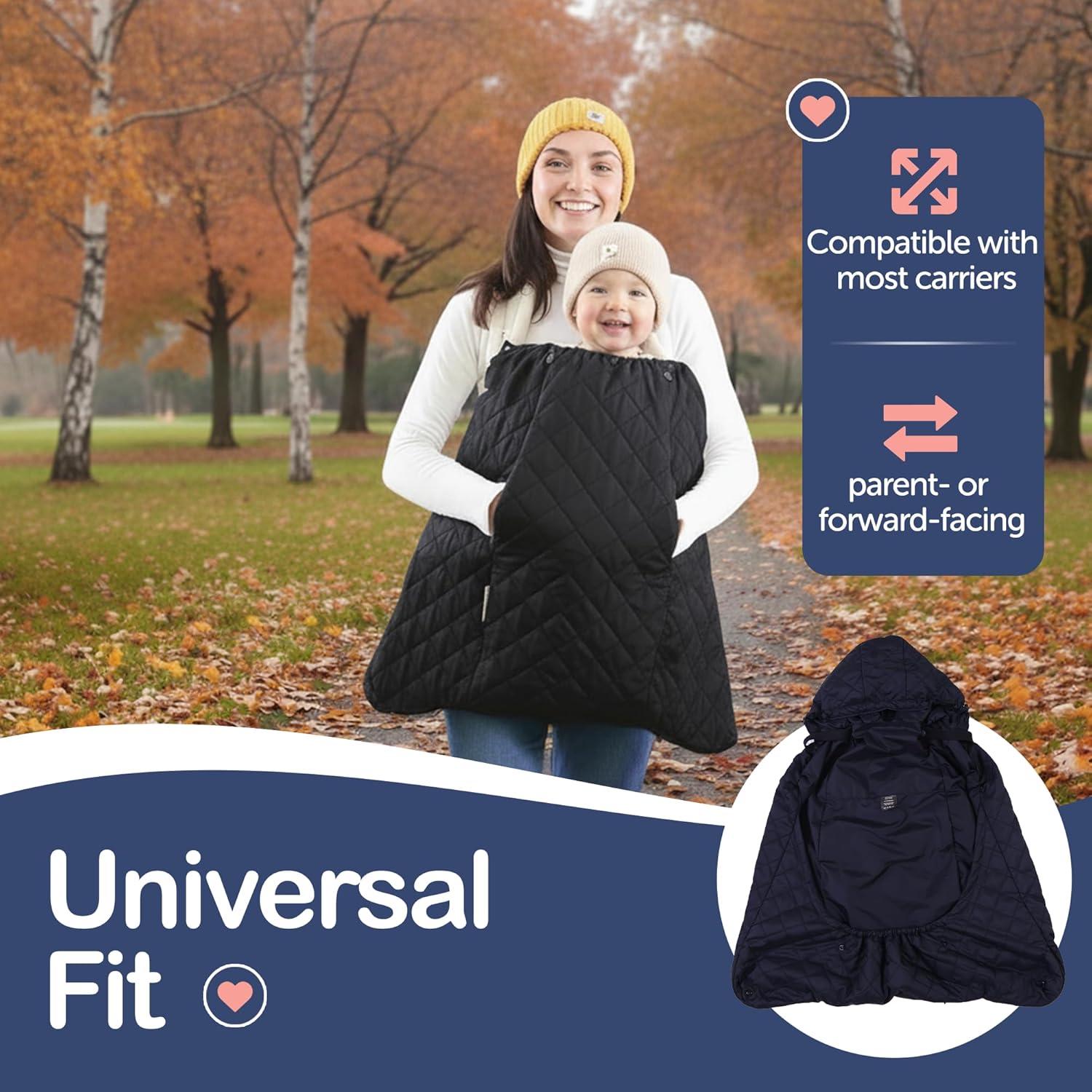 Keep Baby Warm AnywhereWhether you're heading out for a winter walk or just running errands, this baby carrier winter cover keeps your little one warm, dry, and content. Designed to go over the carrier - not your baby's body - it prevents the hassle of layering a bulky coat that can restrict your baby's movement. Use your carrier as usual, then slip this winter baby carrier cover on top like a jacket for the carrier itself. Available in two versions: one with soft fleece lining and another with lightweight windproof fabric, both shield against wind, cold, and light rain. A must-have for cold-weather parenting, it allows you to continue your daily adventures without worrying about unpredictable weather.One Cover, Multiple UsesMore than just a carrier accessory, this flexible baby carrier blanket also works great as a cozy infant carrier cover option. You can use it as a cozy layer on strollers, infant seats, or even as a soft footmuff - making it a smart pick for stroller blankets for babies winter. Designed for convenience and warmth, it helps simplify life for busy parents. From chilly mornings to evening strolls, it adapts to every setting seamlessly.Made for Car SeatsSearching for a winter cover for baby carrier that also works with car seats? This universal black cover is ideal for all. The removable hood and zippered sides allow airflow and flexibility for your baby's comfort. Plus, the secure fit ensures it stays in place without shifting or sagging.Lightweight, Foldable & Travel-ReadyEasier to manage, this winter-ready bunting bag baby folds into its own pouch for easy packing and storage. Whether you're layering it over a carrier or using it as a backup in the car, this is the multi-use cover that adapts to your parenting routine. It's ideal for travel, daycare drop-offs, or spontaneous weekend trips.
