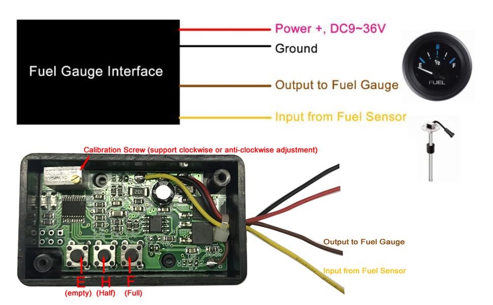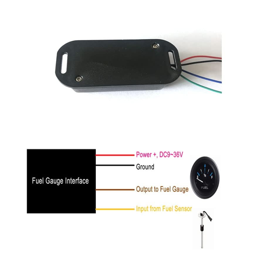 Fuel Gauge Interface Module Ohm Range Converter for Any Fuel Gauges to Match Specific Ohm RangeFuel Gauges are designed to work with a specific ohm range. Different automobile and gaugemanufacturers use different ohm ranges to correctly operate their gauges. This can causeproblems for a person who is updating their vehicle with new gauges or a new gas tank andfuel sender.This module will allow you to use your stock sender with any fuel gauge and vice versa.Features1. Acts as Interface Between Fuel Senders & Gauges2. Reads any fuel sender3. Works with any fuel gauge4. Accurately Corrects OHM Mismatch & Erratic Movement from Fuel Slosh5. Custom Calibration for empty, half level and full6. Mini Size 20(w) x 16(H) x35(L) mmInstructions1. Instructions1/Mount module in a clean dry cool position.2/Connect wires as guide photo above3/Using store mode,program and store Full,Half,Empty and “Power on” positions.4/Using power on mode,program how you want the gauge to operate when car is started.5/Operated in run mode and check.IMPORTANT NOTICEWhen adjusting the screw, move gauge from Full to Empty to avoid hysteresis error.Some gauges are very slow to move. Please allow time to stabilize.The tank sender must have the same Ground as FM101 , otherwise erratic readings will result.FM101 will convert input resistance signal to a target resistance signal, so that Fuel Gauge can work with different type/rangeof fuel sensors.The Full,Half,and Empty position can be programmed.The“in-between” positions between F,1/2,and E are calculated by the microprocessor and are linear.The“power on” gauge start position is selected from either the sender position or the programed position.The output is a npn pulse width modulated signal which may cause“buzzing”in undamped gauges.