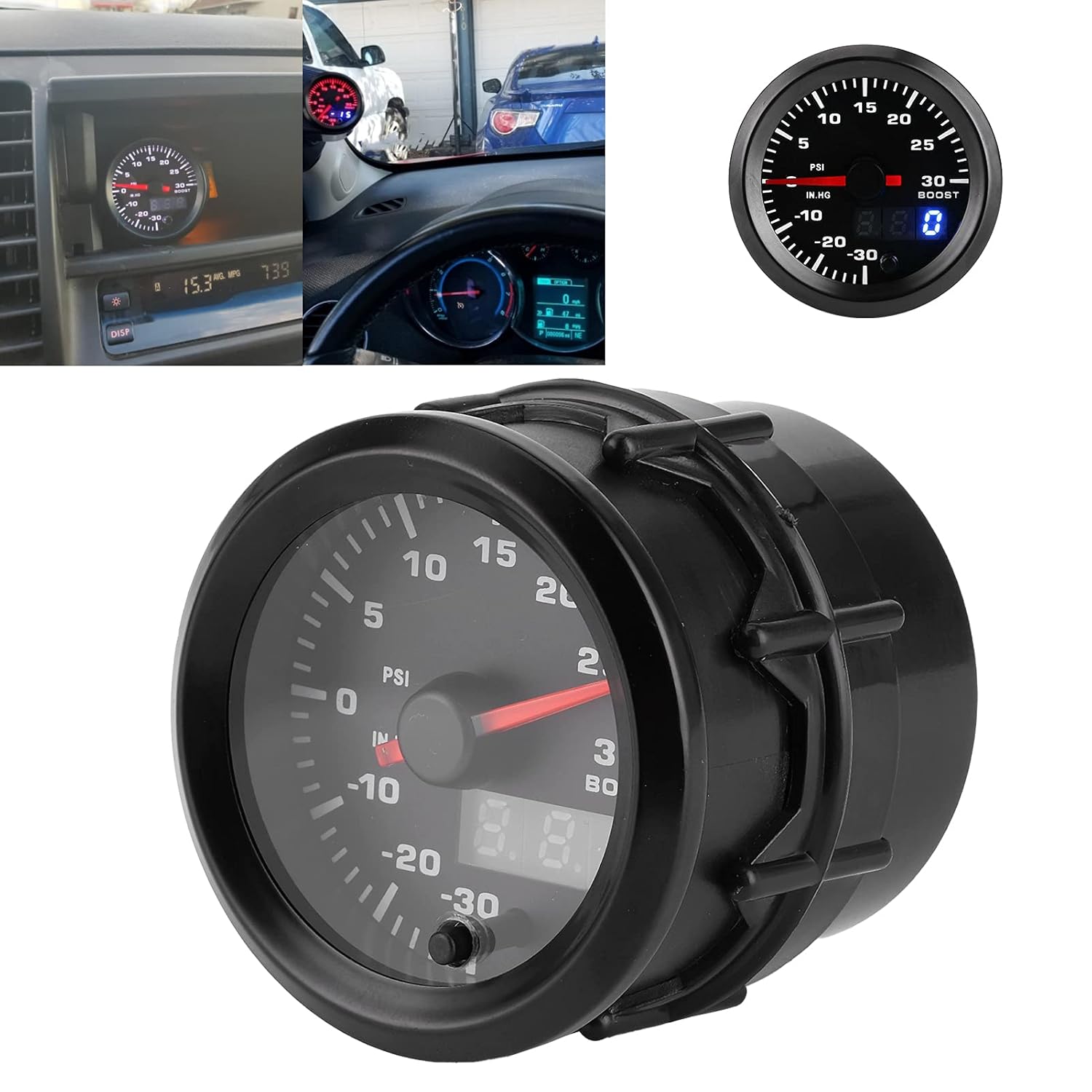 Specification:Item Type: Turbo Boost GaugeMaterial: PlasticFitment: Universal for all 12V Cars.Boost Levels: 0-30 IN.HG, 0-30PSIDiameter: Approx. 2in/52mmCurrent: IGN MAXIMUM 0.3A ILM 0.3APower: DC(10-15V) 12V ProfessionalWiring: Red-positiveBlack-negativeGreen-connect boost sensorPackage List:1 x Turbo Boost Gauge1 x Power Cord1 x Boost Sensor1 x T Adapter1 x Connector1 x Hose1 x Manual