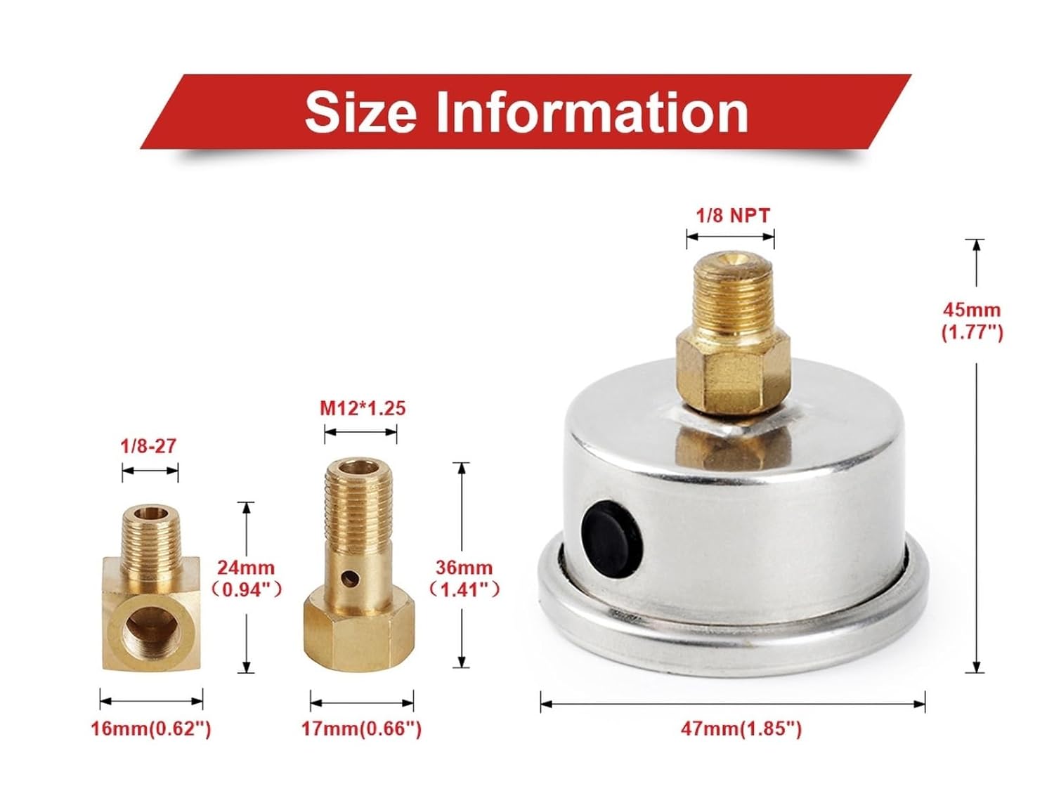 ==========Other Part Number : Fuel Oil Pressure Liquid Filled GaugeCountry/Region of Manufacture : CNManufacturer Part Number : Oil Fuel Pressure GaugeInterchange Part Number : Npt 1/8 Fuel Pressure GaugeSpecial Features : Fuel Pressure GaugeItem Weight : 0.2kgItem Height : 45mmItem Width : 47mmItem Length : 47mmMaterial : Aluminum alloy,Copper