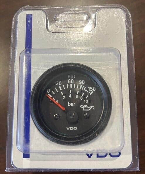 Brand new VDO genuine oil pressure gauge. 2-1/16” or 52mm mounting holes, M4 stud mounting. 0-150 psi (0-10 bar), input range 10-180 ohms. Flood lighting, light bulb included. Red lighted pointer. Wiring instruction included. Retail packaged.