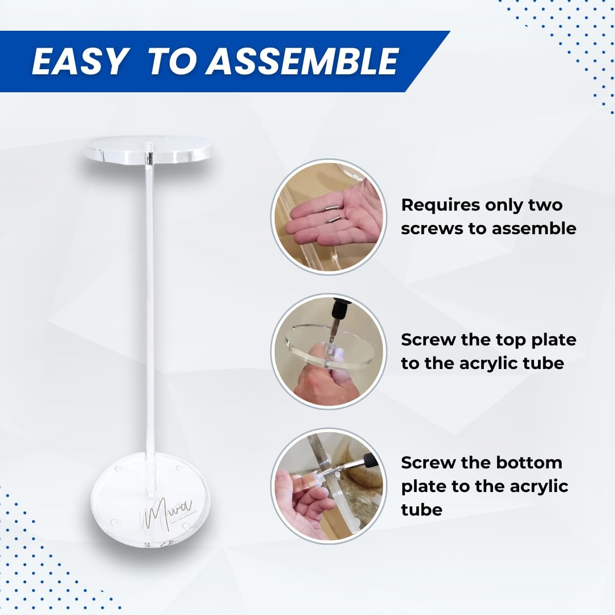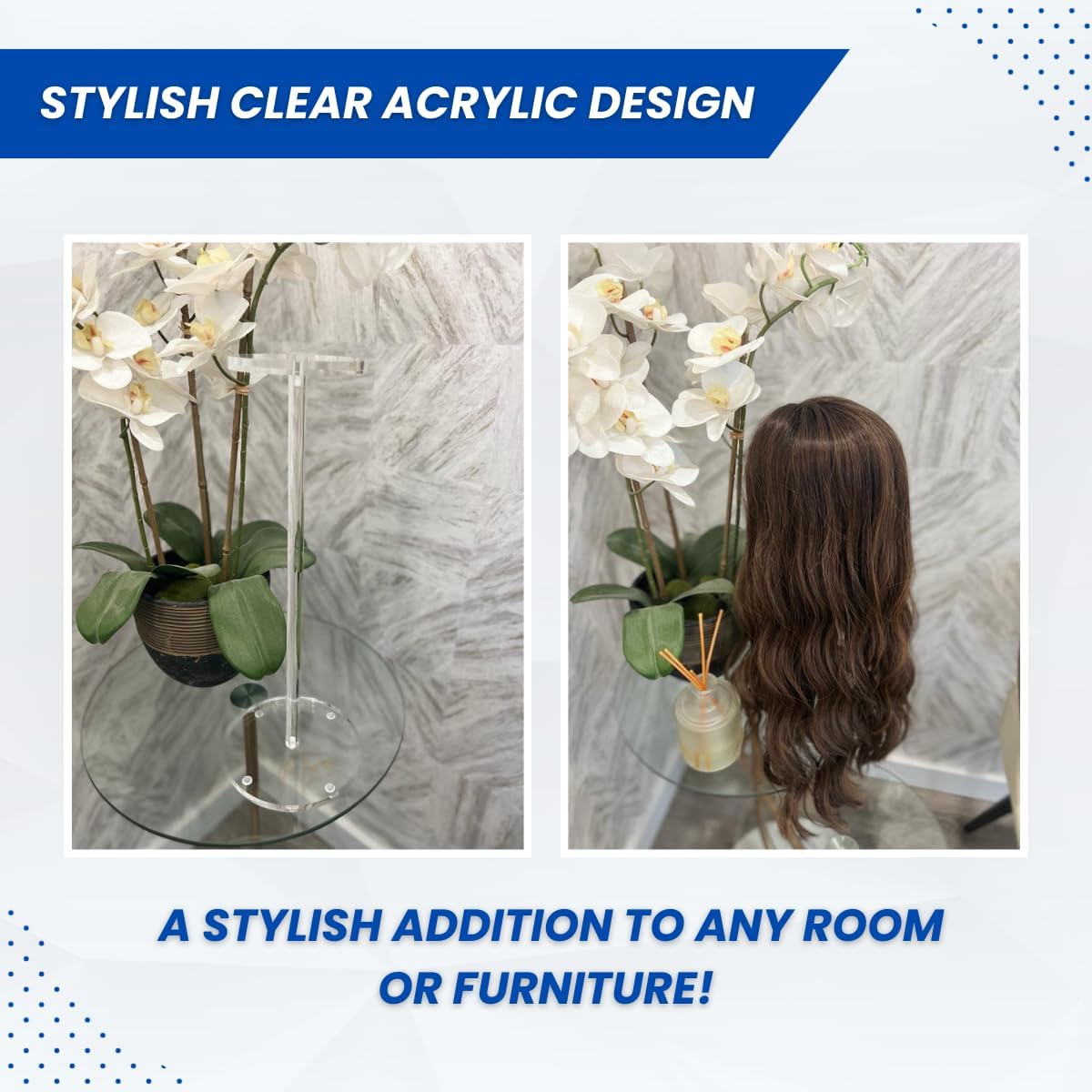 Are you tired of your beautiful wigs losing their charm, shape, or getting all tangled up? Well, we've got just the thing to make sure your wig game is always on point – our MWA 16 inches Fancy Acrylic Wig Stand! Built to Last We've crafted this stand from top-notch, crystal-clear acrylic that not only looks classy but is super-durable too. No need to worry about wear and tear – your wigs are in good hands! Keep the Magic Alive This stand is like a magic wand for your wigs. It keeps them looking as fabulous as the day you got them, no more kinks, creases, or frizz to deal with. Fits All Shapes and Sizes Whether you're into long, short, curly, or straight wigs, our stand can handle them all. It's like a one-size-fits-all solution for your wig needs. Hassle-Free Setup We know you've got better things to do than figuring out complicated instructions. Our stand comes in just three pieces that fit together like a dream, and taking it apart is a breeze too! Elegance Meets Functionality This stand not only takes care of your wigs but also looks stunning while doing it. It's perfect for displaying your wig collection or adding a touch of class to your salon or boutique. More Than Just Storage Besides keeping your wigs in shape, you can use it for air-drying after washing. It's like a multitasking pro for wig care. So, if you're serious about keeping your wigs in top-notch condition and looking drop-dead gorgeous, our Acrylic Wig Stand is your new best friend. Specification: Material: acrylic Color: clear Size: approx. 4.25 inches in top diameter, 6 inches in the bottom diameter, and 20 inches in height