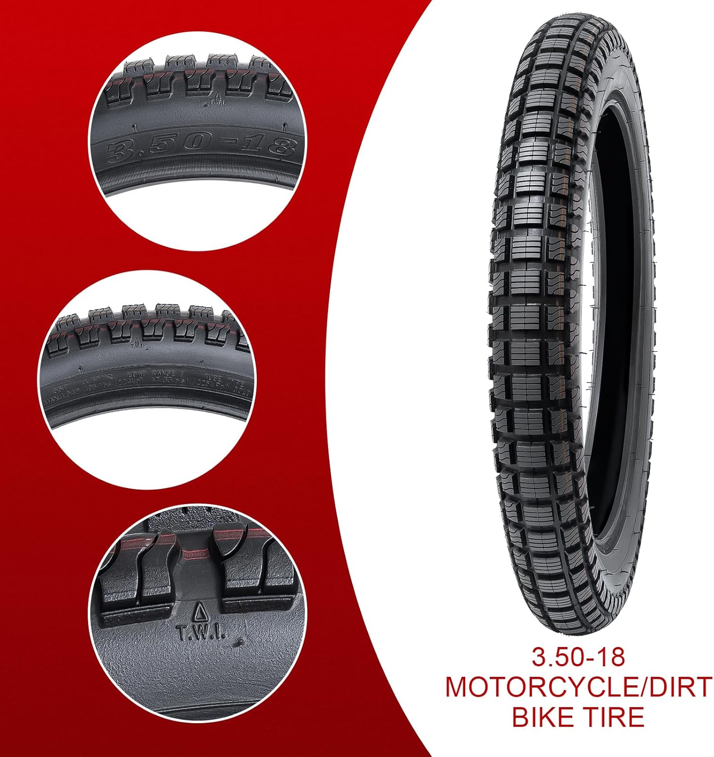PACKAGE INCLUDES: 3.50-18 tire (x1),3.50/4.10-18 TR4 straight valve stem heavy duty inner tube (x1)