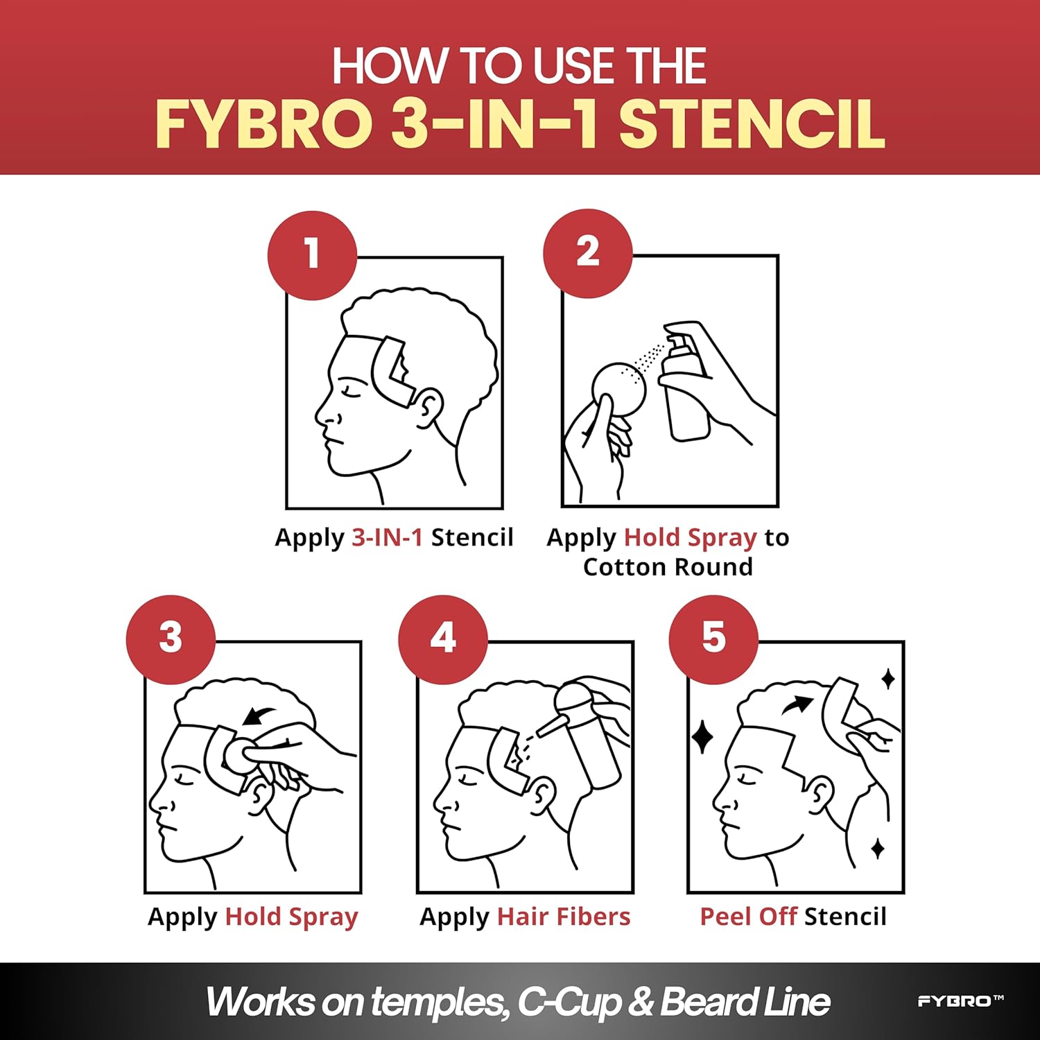 Achieve professional, barbershop-quality results with the FYBRO 3-IN-1 Side Hairline & Beard Enhancement Stencil, the ultimate disposable solution for clean, sharp edges beyond the front hairline. Designed to complement your front hairline lineup, this versatile tool shapes the side hairline (vertical bars), C-cup curves, and beard lines for a crisp, natural-looking finish every time. Designed for convenience and precision, it works as a shape-up tool, edge-up guide, and beard line stencil, making it ideal for barbers, stylists, or anyone maintaining their look at home. Each stencil sticks directly to the skin for a hands-free application, acting as a reliable guide while applying hair fibers or spray for consistent, professional-looking results. This hair enhancement and shape-up tool is compatible with all hair fibers and spray-on products, including FYBRO Hair Fibers (sold separately). Simply peel, stick, and apply to define edges, fill in thin areas, or sharpen your side hairline and beard lines with no mess or cleanup. Lightweight and travel-ready, these disposable stencils stay securely in place and are perfect for use at home, in the shop, or on the go.