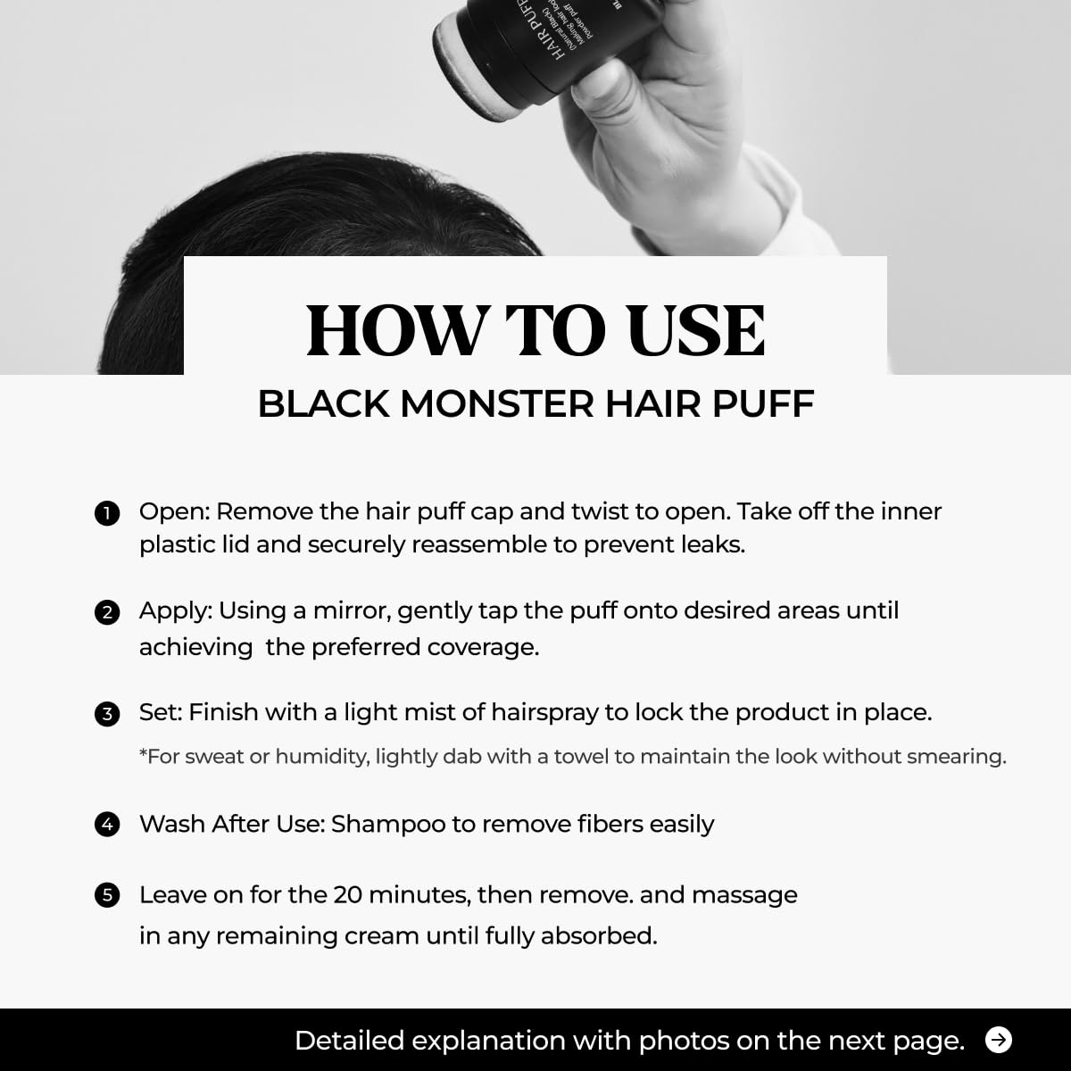 Achieve fuller, thicker-looking hair instantly with Black Monster Hair Puff in Natural Black. This easy-to-use hair fiber powder seamlessly blends with your natural hair, providing a natural and undetectable finish. Designed for both men and women, it features ultra-fine particles and a patented puff applicator for precise control and even coverage. Infused with 16 scalp-friendly botanical ingredients, it ensures a safe and irritation-free experience.