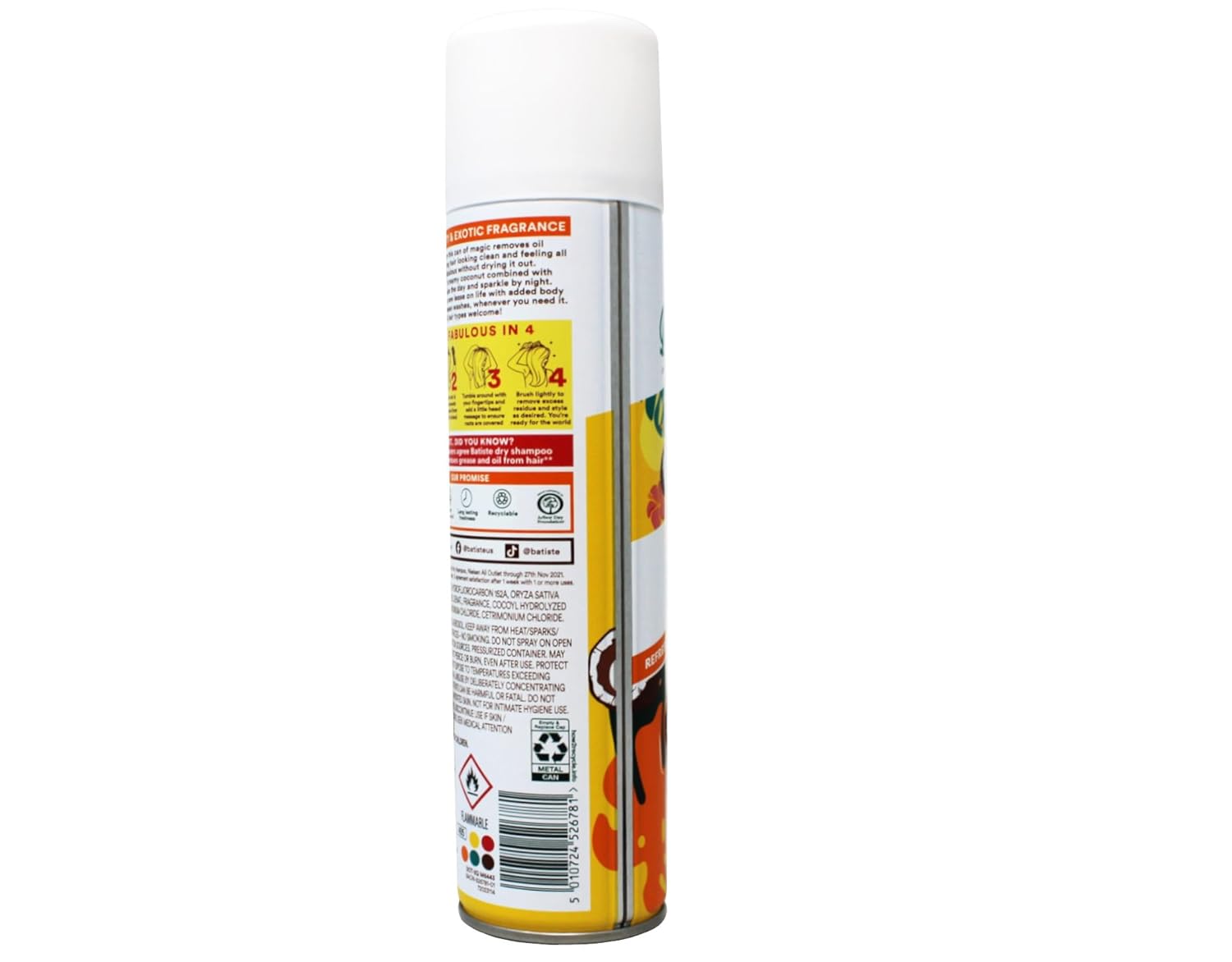 Take your hair from flat to fab with Batiste Tropical Dry Shampoo. This waterless shampoo targets excess oil and grease at the roots to breathe new life into your hair, leaving you feeling clean between washes. Batiste Tropical Dry Shampoo has a happy and summery scent that gets you ready to face the world, while dreaming of vacation. The Batiste Tropical spray locks in subtle, exotic scents of coconut, vanilla, and jasmine that never overpower. Batiste Dry Shampoo instantly makes your hair feel clean and fresh by removing oil, and provides added body and hair texture to give the appearance of fuller hair. Perfect for the girl-on-the-go, using this vanilla, jasmine and coconut dry shampoo spray helps save time by making styling your hair fast and easy. Let's face it, life gets crazy sometimes and skipping a wash (or two) is inevitable. Using this dry shampoo spray is easy. Shake the shampoo bottle thoroughly, section your hair and spray as much as you want 12 inches from your roots, use your fingertips to massage the Batiste shampoo into your hair and brush or style your hair however you want so you can get going. With Batiste Dry Shampoo, you can be confident your hair looks great no matter what life throws your way.