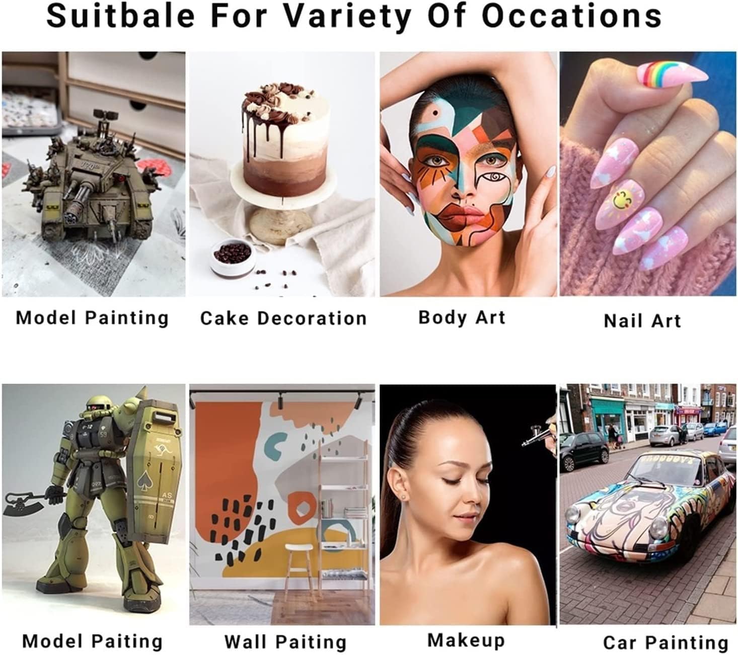 This professional makeup airbrush is widely used in model making, cake decorating, tattoos, nail art, etc. Perfect for cake decoration, nail art beauty, body art, make up, tattoo, craft, models and fine art such as car painting illustration, textile and t-shirt painting.Features:Airbrush for colorfulchocolate, cake decorations,tattoos, make up, nail art, etc.The spray and atomization effect is very fine.Double action trigger control saves raw materials and durable.Widely used by the general model enthusiasts.Exquisite atomization and fine lines with this airbrush.It won't produce off color when coloring something.Specifications:Feed Type: Gravity FeedSwitching Mode: Dual ActionFluid Cup Capacity: 7cc + 20cc + 40ccHow to Spray:1. Fill fluid in the cup after thinning appropriately.2. Hold the airbrush lightly in your hand.3. By pressing the main lever, a stream of air emerges. Then draw it backward gradually for color atomization.4. The spray pattern is in accordance with the distance between a work surface and a airbrush.5. For fine line spray, remove the needle cover and hold the air brush near a work surface.Maintenance:1. Empty the fluid cup and wash with water or solvent by a brush.2. Refill cup with water or solvent, then block the needle cover with a finger and spray.3. The air flows backward into nozzle to clean the paints remained the airbrush.Package List:1 * Dual-Action 0.3mm Airbrush1 * 7cc Fluid Cup1 * 20cc Fluid Cup1 * 40cc Fluid Cup1 * Inlet Connector1 * Instruction Manual