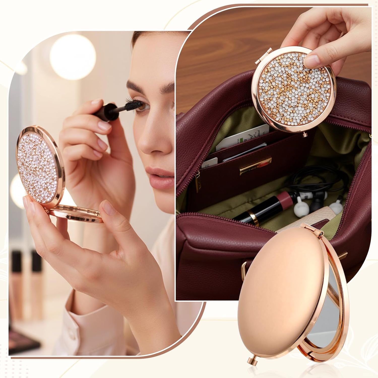 Dear customers, welcome to our store and thank you for your choice. If you are not satisfied with anything during the shopping process, please feel free to let us know and we will correct it in time and do our best to provide you with a pleasant shopping experience.Specification:Product Name: 16 Pcs Rhinestone Compact Mirror, 1x/2x Magnifying Double Sided Pocket Mirror 2.75 Inch Travel Size Portable Mirror Color: Rose GoldMaterial: MetalProduct Size:Diameter 7 cm/2.75 inchThickness 1.3 cm/0.51 inchProduct Weight: 1180 gPackaging: BoxPackaging Dimensions: 17.5 x 11.5 x 9.5 cmPackage List:16 x Gold Compact Mirror