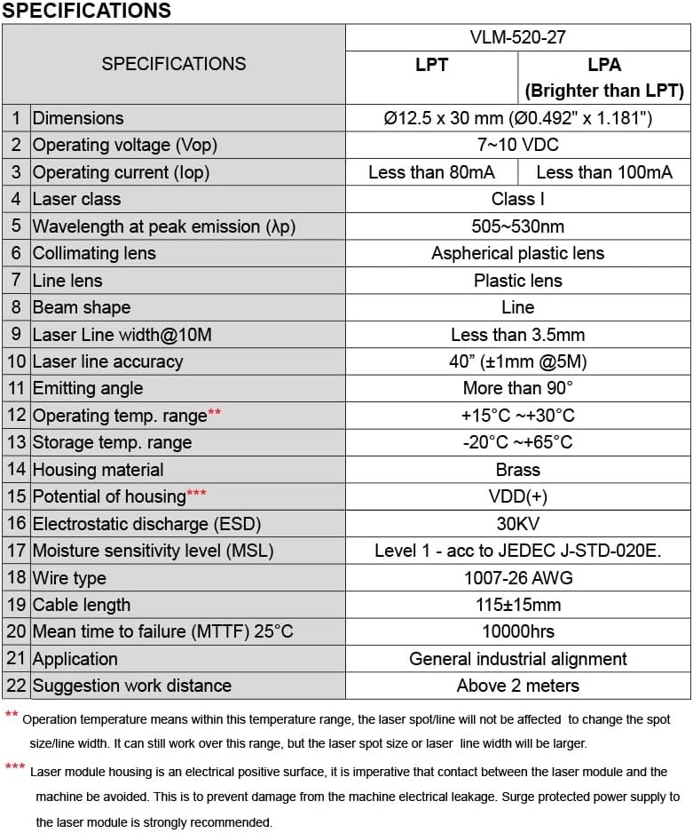 APPLICATIONS: Straight Green Line from Direct Green Laser Diode. Wood processing. Metal processing. Stone processing. Textile industry. Food industry. Automotive industry. Medical science. Why choose direct green laser module? Direct Green Lasers are direct-diode semiconductor lasers. The stability of the laser output is greatly improved. Most green laser modules on the market are DPSS (diode pumped solid state) laser modules. DPSS (Diode-Pumped Solid State) is a conventional laser module that emits an infrared laser diode with a wavelength of 808nm and turns it into green by the crystal. This is actually a very inefficient way of producing a laser beam as there is significant power loss. For Direct Green Laser Module, the semiconductor laser itself emits directly. The stability of the laser output is greatly improved since there is no additional crystal. Thanks to their good efficiency, the temperature increase of the lasers during operation is minimized. A long lifetime and high reliability at continuous operation is guaranteed.Mean time to failure (MTTF) 77°F: 10,000 hours. Integrated industrial use direct green laser diode has 10,000 hours average working life.