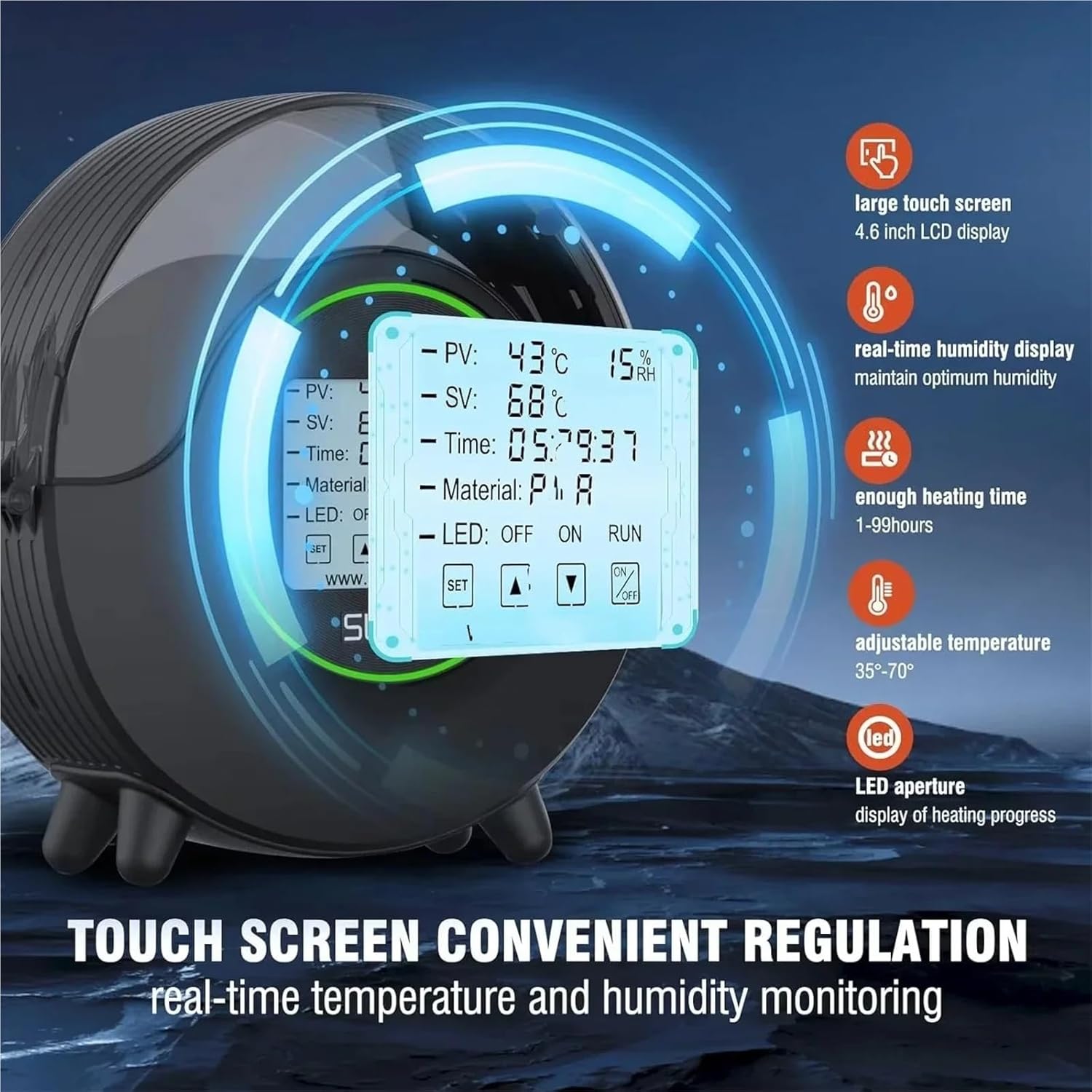 Keep Filaments Strong & FlexibleBy Using Filament Dryer Box S2 to removing moisture from the filament before its used in the 3D printer S2 filament dryer helps to ensure that the filament will be dryed which will result in better print quality and fewer failed prints. This is important in save time, money, and frustration by improving the reliability and consistency of their 3D printing process.Touch Screen & Easy Operation3D filament dry box S2 has a new touch screen that is designed to provide a tabletlike operation experience for the user The screen is 342*2.87 inches in size, which makes it easy to navigate and use. The touch screen also allows user to easily switch between and and offers one-key recommended temperature settings for different types of filament. This makes it easy for the user to set the appropriate drying temperature for their filament.Easy to Use & Quality Guaranteed Allows you to print while drying 2 inch large LCD screen monitorAble to display temperaturetime clearly and brightly Decrease Noise when Printing less than 10db while operating.Wide Compatibility Rangecompatible with a wide range of filament brands and diameters. It can work with all mainstream 3D filament brands and all standard filament diameters of 1.75mm/2.85mm/3.00mm. This means that it can be used with a variety of filaments, including PLA, PLA+, PETG, TPU, ABS, and even high-end filaments like PA and PC. This makes it a versatile and convenient option for users who want to dry their filament.Drying & Printing at One TimeThe feedout coil also allows the filament to continue to dry in the dryer as its being fed to the printer This means that the filament will be dry and ready to use when it reaches the printer.S2 Filament Dryer BoxSize:265(L)*274(W)*115(H)mmColor:White/BlackMax Volume:210*85(H)mmOptimum Ambient Operating Temperature:20~35Relative Humidity:90%Temperature Setting Range:35~70Adapeter Parameter:Input:AC100V~240V,50/60HzOutput:DC:24V±1.2V,2AFilament Diameter :1.75mm/2.85mm/3.0mmS2 Filament Dryer Box Features:1. Dual Heating Plate:360° Surrounding Heating2. Large Display Screen:4.6 Inch LCD, display: Temperature/Time/Humidity/Filament Type/Countdown Time3.Dual Temperature Probe, detecting box & heat plate temperature high accuracy and security4 Max temperatureUp to 70C could dry special filament such as PAPC5 Easy operationOnekey Button6 LED Marquee, display Real-time work stateFAQ:Q:What the maximum temperature of a S2 dryer box?A:The maximum temperature of the S2 dryer box is 70. It can increase or decrease the temperature according to personal settings (Temperature setting range: 35~70).Q:Can the drying box support printing while in use?A:When the drying is turned on, it can provide printing at the same time, which will make the printing effect better.Q:Is the noise of the drying oven loud when in use?A:The noise generated is very low when in use and can be ignoredQ:Are all filament applicable?A:Within the temperature range of the drying box (35-70), filament that meet the drying conditions are applicable.Q:Are the drying box with fans?A:Yes,our drying box is equipped with fans and all the firmware is the latest version.Tips:For best results dry your filament before and during printing.For long print operations drying during the printing process will produce more consistent print results. When the ambient temperature is low the dryer will take longer to reach the set temperature,extend the drying time by 1 hour.==========High-concerned chemical : NoneModel Number : S2 Filament DryerItem Type : Filament Dryer BoxMax Temperature : 70°CFilament wire diameter : 1.75mm/2.85mm/3mmGross Weight : 1.25KGMaximum capacity : 10 x 85 mm