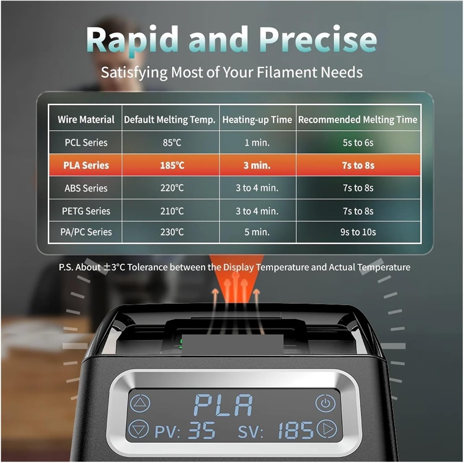 [Easy Operation] User-friendly design with a simple, intuitive interface (Power adapter not included. Use at least a 5V 2A adapter to avoid power-on issues). Select the appropriate settings based on the filament type, and follow detailed instructions and video tutorials. Perfect for beginners, with no complicated adjustments needed. Fusion completes in 10-15 seconds. (In order to guarantee a good connection, it is recommended to dry the filament before bonding to ensure that the filaments are not in a damp state.)[Visual Operation] Built-in window and display screen for real-time monitoring of the fusion process. Provides real-time temperature information, ensuring users are informed of each step and the equipment's status.[Efficient Welding, Excellent Results] Professional fusing technology ensures strong joints and smooth surfaces without affecting print quality. Produces models with smooth, seamless surfaces and stable performance during printing, ensuring high-quality results for both detailed and large components.Note!Power Input Specification: 5V 2A. Using a power source with a current below 2A may result in the device not functioning or heating slowly.!!! This device may be incompatible with Qualcomm QC3.0 and above (excluding QC3.0) or USB PD2.0 and above versions of phone chargers.The device is also incompatible with multi-functional charging plugs.==========Model Number : FC01Item Type : Mechanical Kit/Hardware PartsBrand : SUNLUColor : BlackPower Input : AC 5V 2ACompatible Filament Diameters : 1.75±0.03mmCompatible Filaments : PLA/ABS/PETG/PA/PC 3D MaterialsMax Tempture : 240