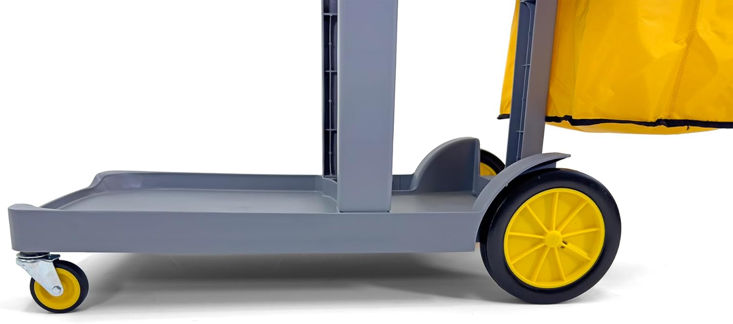 Optimize your storage space with this solution: it includes 3 storage shelves with raised edges to keep cleaning tools organized. The platform base provides ample space for storing janitorial supplies, while hooks on both sides hold mops, brooms, and dustpans to conserve shelf space, Crafted from durable polypropylene (PP) material and a sturdy plastic frame, this product is capable of supporting up to 450 lbs., guaranteeing reliable and long-lasting performance.