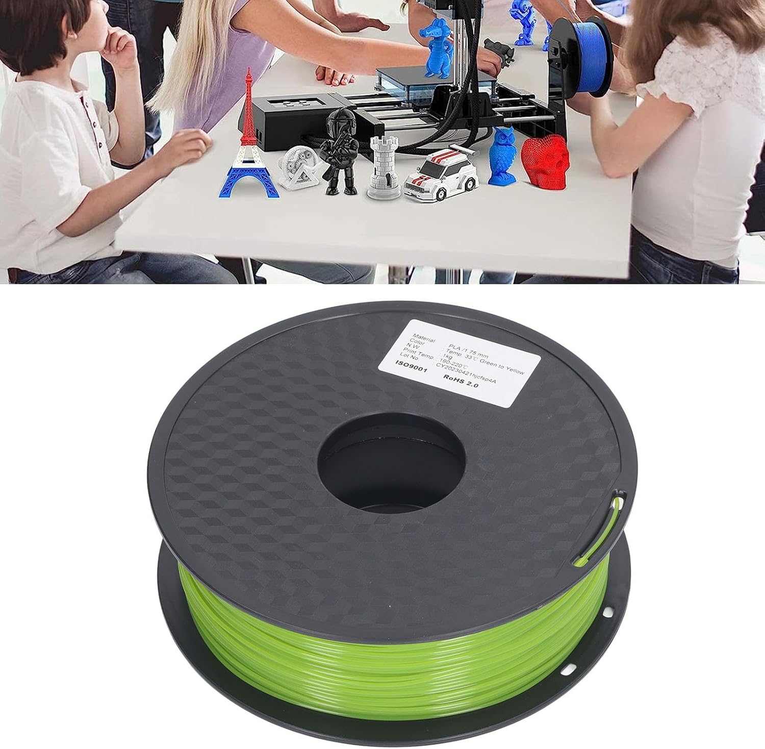 Item Type: 3D Printer FilamentMaterial: PLASpecification: Green to yellowPrinting Temperature: 190-220°CPrinting Speed: 30-90mm/sPlatform Temperature: 0-50°CPackage List:1 x 3D Printer Filament
