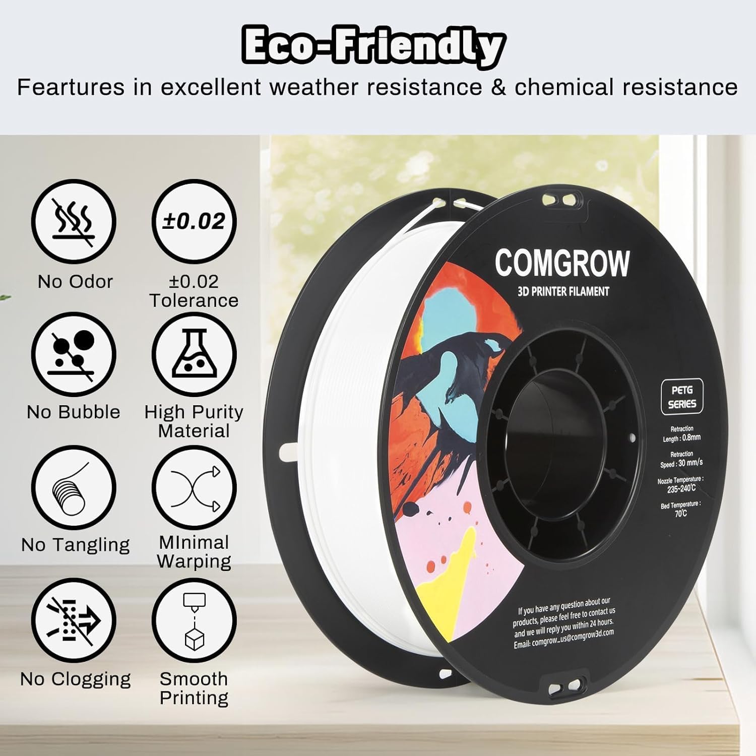 PETG 3D Printer Filament 1.75mm, High Precision and Tough 3D Printer Filament (2LBS), Dimensional Accuracy +/- 0.02 mm, Fit Most 3D Printers White