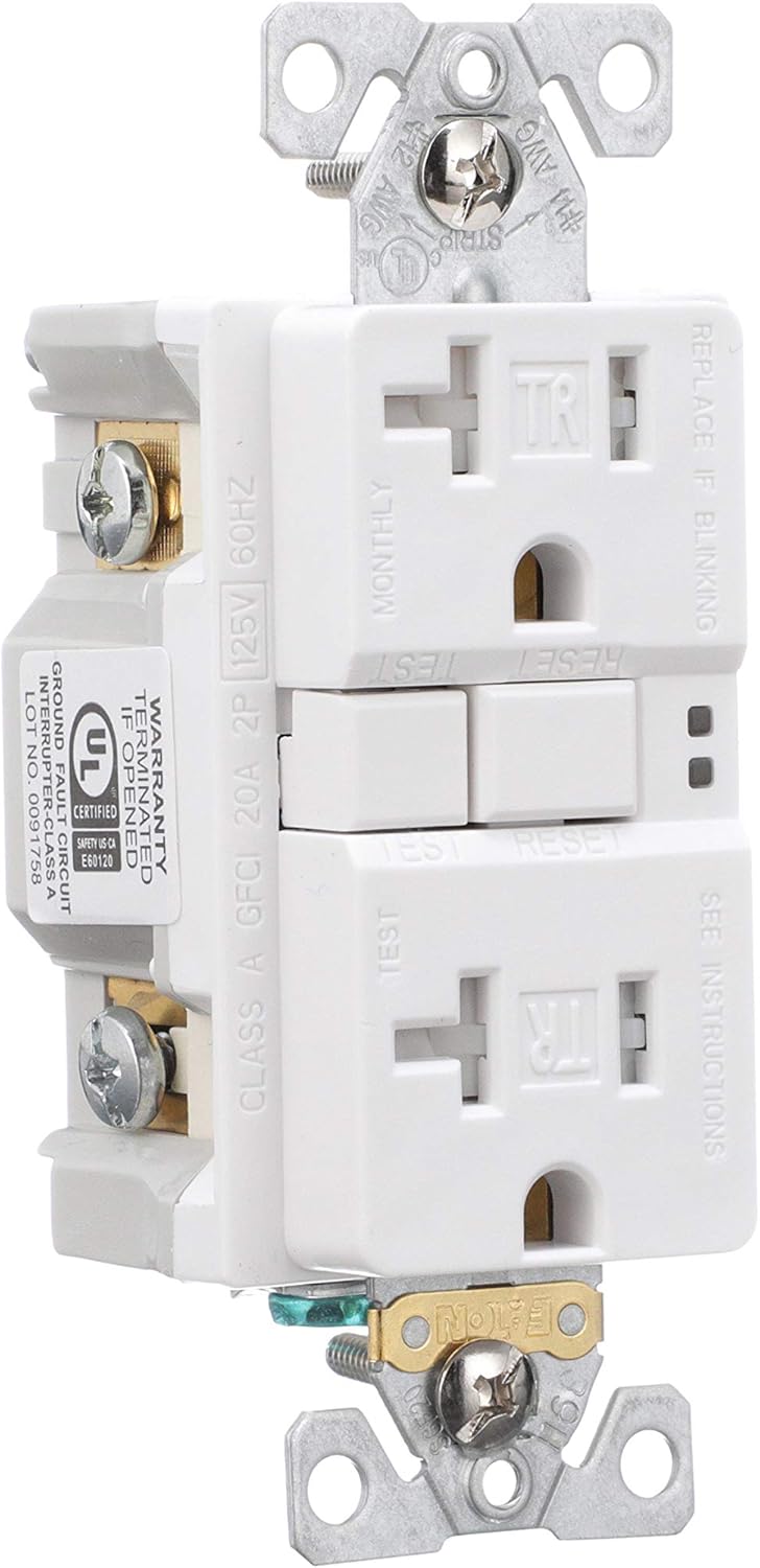Eaton's GFCI Self-Test Tamper Resistant Duplex Receptacle provides protection from dangerous electrical shocks caused by ground faults. Our GFCI devices automatically self-test periodically to ensure GFCI protection and continuous safety. In addition to being tested to the highest standards to help ensure safety, Eaton's GFCIs will deny power and prevent re-setting if the device is no longer able to provide safe, protected power. The built-in indicator lights provide quick notification of a tripped or “end of life” condition. Additionally, tamper resistant (TR) GFCIs feature a built-in UL listed safety shutter system that prevents the insertion of foreign objects into the receptacle openings.
