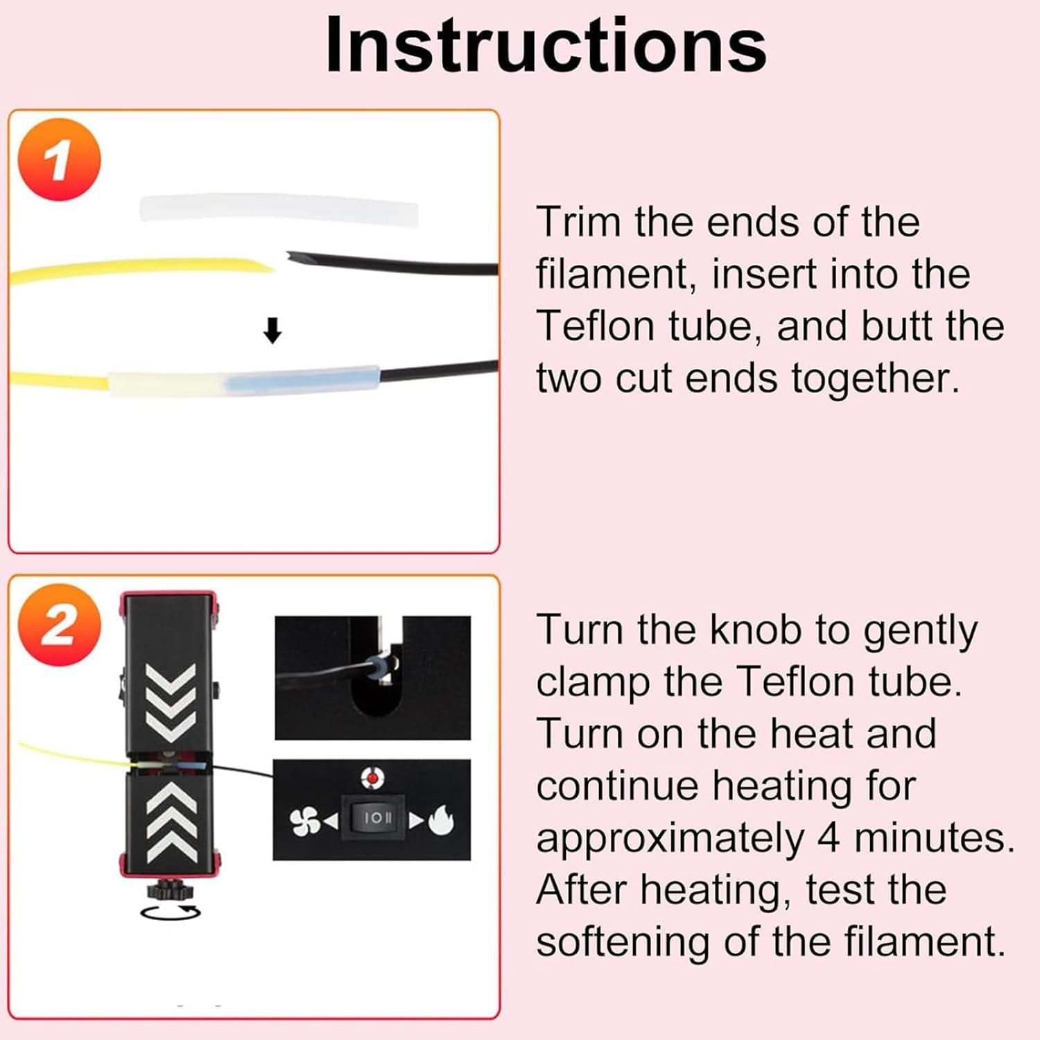 The filament welder features a melting point diameter of 1.75mm, making it compatible with all 1.75mm 3D printing filaments. Perfect for a variety of DIY projects, it allows for seamless connection of the same filament material in different colors, enabling you to express your creativity in 3D printing. Specifications: - Material: Metal - Power input: 100-240V - Power output: 12V4A 48W - Applicable filament diameter: 1.75mm - Applicable filament type: PLA/ABS/PETG/PA/PC - Size: 152.5*52.35*46.5mm Product includes: - 1 Filament Welder - 1 Adapter - 1 x Filament peeling rack - 1 x Peeling device - 100 x PTFE tube Only the above package content, other products are not included. Note: Light reflection and different displays may cause the color of the item in the picture a little different from the real thing. The measurement allowed error is +/- 1-3cm.