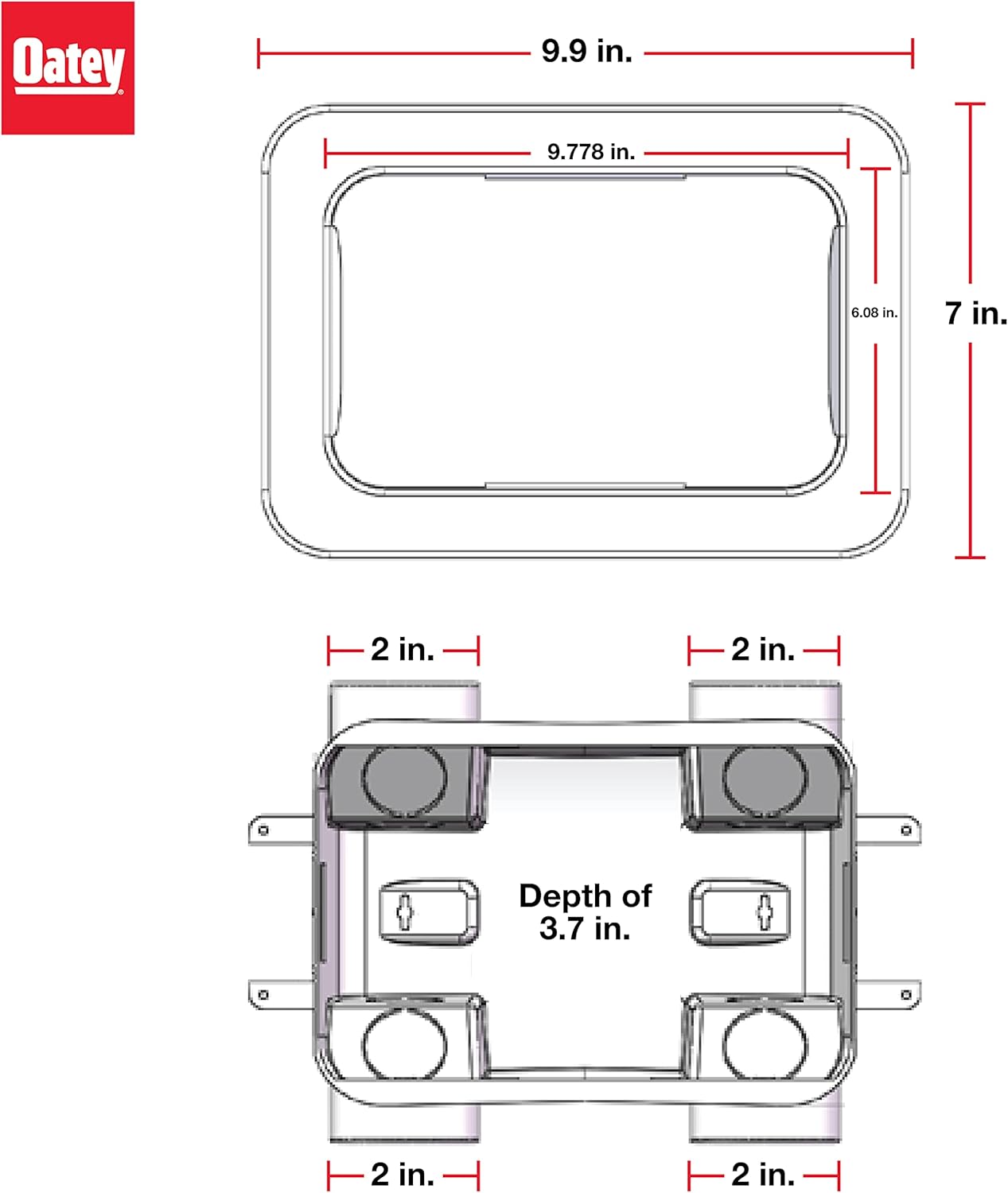 Product Description The Oatey 2 X 4 Washing Machine Box allows you to attach water lines from the top or bottom in both commercial and residential applications. It includes four knockout drain caps for extra layout flexibility. Oatey products have earned the trust of plumbing professionals for over 100 years. From the Manufacturer Direct stud mount capability - Snap-on faceplate frame accommodates up to 1" drywall - Two support brackets and direct stud mounts for easy mounting - Box, Faceplate, and Brackets made from PVC