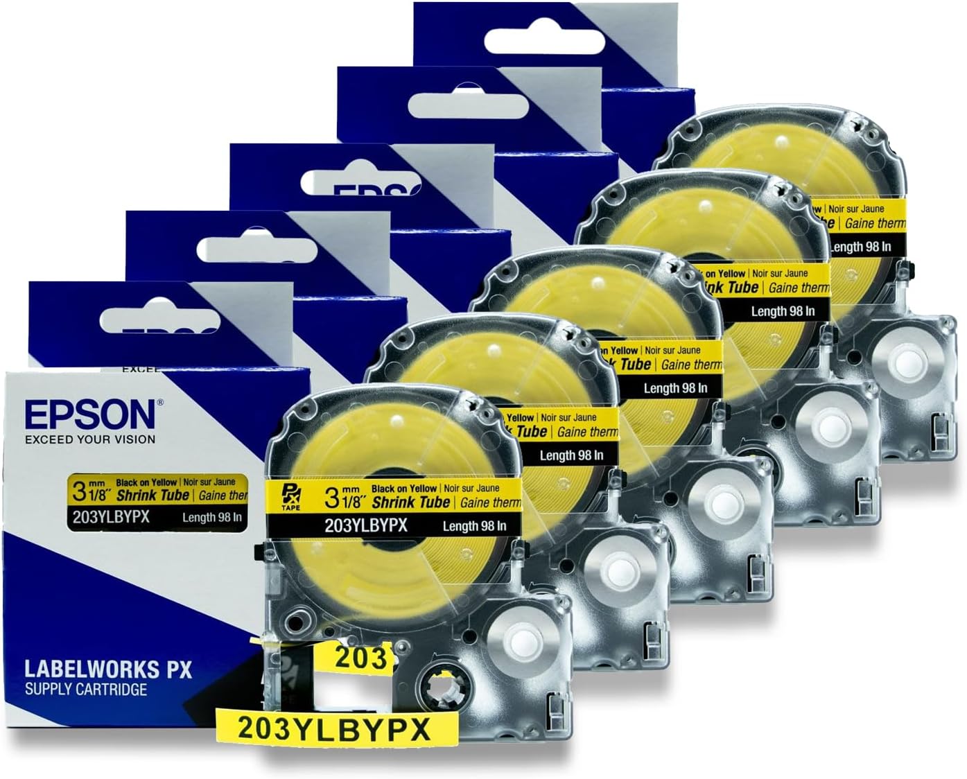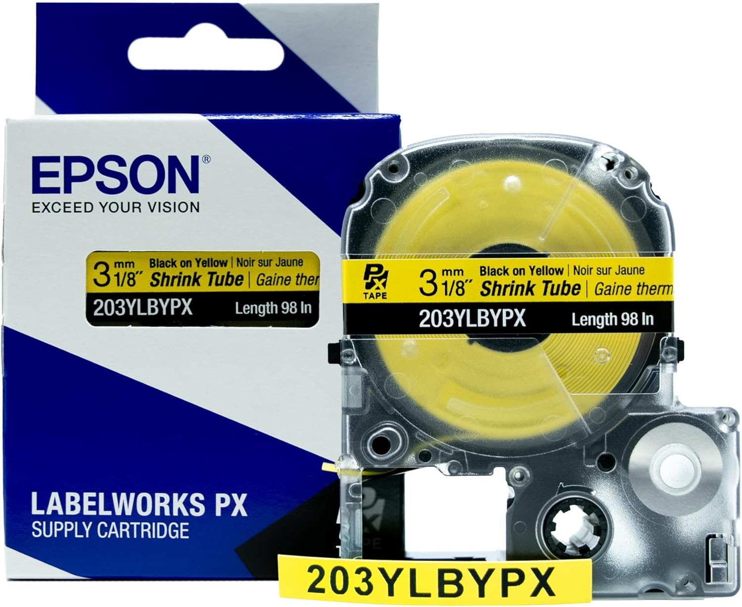 This 7/8" (21MM) wide, 8 ft (96") long, 000-1 AWG shrink tube features black text on yellow shrink tube (3-to-1 shrink ratio). Printable heat shrink tubing from LABELWORKS PX provides a secure, durable and legible alternative for marking wires, cords, and network cables. With our continuous roll heat shrink tube cartridges, you can choose the length of the tube and the margin settings so you never waste material or have to trim long labels with a scissors. Our heat shrink labels offer industry-leading resistance to abrasives, chemicals, and weather, ensuring label applications remain legible even under extreme conditions. In terms of flexibility, LABELWORKS PX heat shrink labels remain flexible and readable in applications where they are weathered constantly by the environment they are in. Unlike competitors, LABELWORKS PX heat shrink tape cartridges provide reliable jam-free printing and are designed to be cross-compatible with all PX printers. The 221STBYPX shrink tube cartridges are compatible with the Epson LABELWORKS industrial label maker printer models: LW-Z5010PX, LW-Z5000PX, LW-PX900, LW-PX800 and the K-Sun industrial label maker printer models: PEARLabel360.