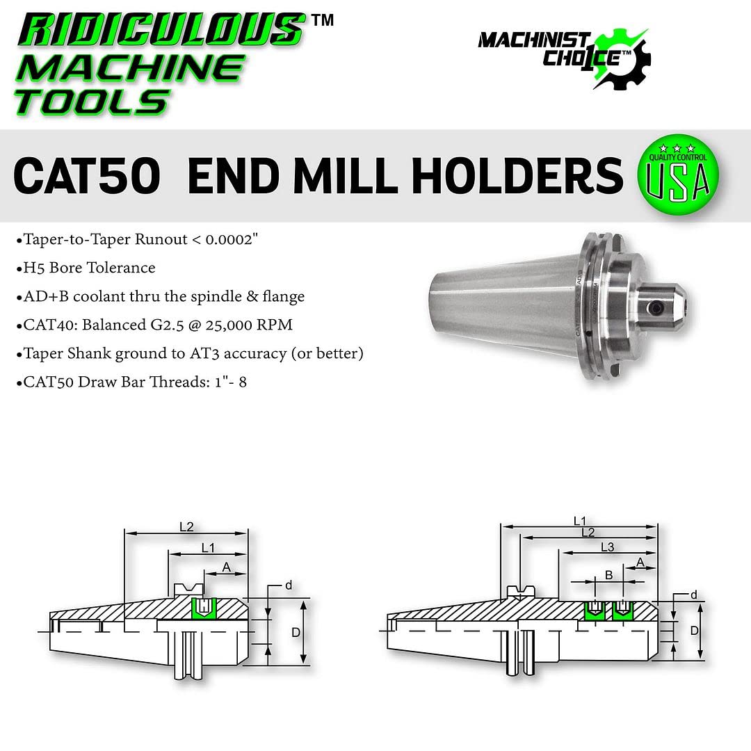 High Precision CAT 50 END MILL Holder, Taper to Bore Runout <0.0002" Balanced G2.5 x 25,000 RPM, Made out of High Quality Chromium Steel, H5 Bore Tolerance, DIN AD+B Coolant Capabilities, Taper Shank Ground to AT3 Accuracy ( Or Better), CAT40 DRAW BAR THREADS 1"-8, 100% inspection quality control in the USA. Mirror Bright Finish Machinist Choice..... VETERAN OWNED........