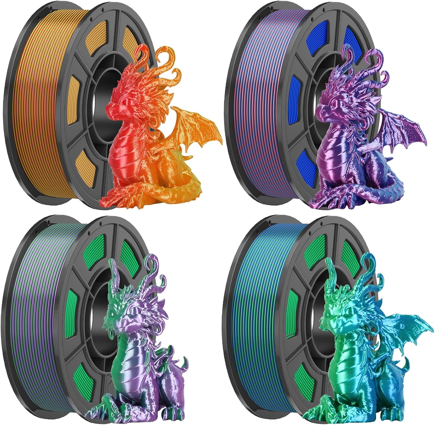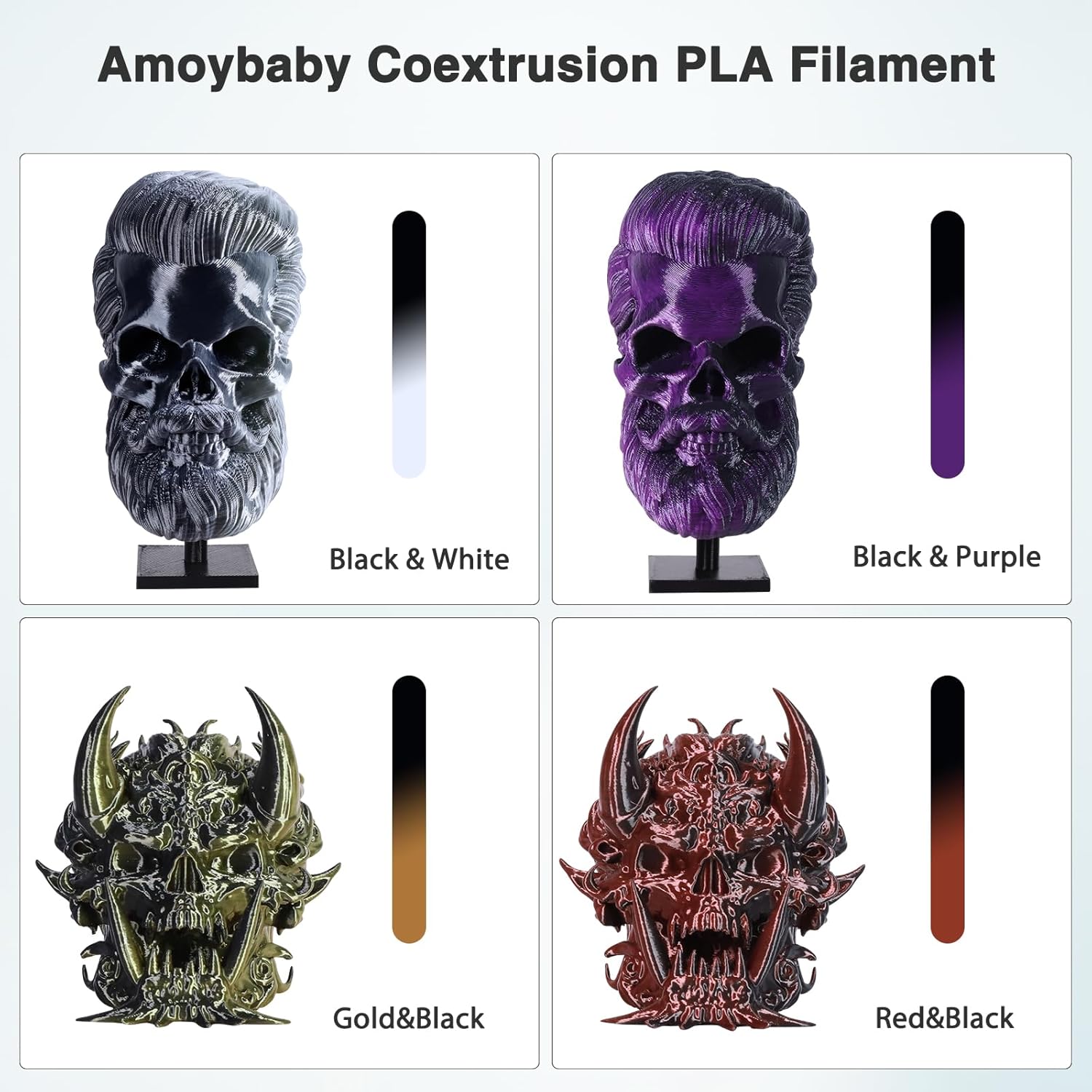 Elevate your 3D printing projects with Amoybaby's stunning dual-color silk PLA filament bundle. This premium package includes 8 striking color combinations - blue-green, gold-red, purple-green, blue- rose red, black-gold, black-red, black-purple and black-white - each delivering eye-catching, silk-like finish to your prints. With a standard 1.75mm diameter and impressive dimensional accuracy of +/- 0.03mm, these filaments ensure consistent, high-quality results. Each bundle contains a generous 2kg (4.4lbs) of material, split between two spools, giving you plenty of capacity for multiple projects. Compatible with most FDM 3D printers, these filaments allow you to create sophisticated multi-colored prints with professional-looking results. The silk-like sheen adds a premium touch to your creations, making them perfect for decorative items, prototypes, and display pieces. Whether you're a hobbyist or professional, these filaments offer the perfect balance of quality, aesthetics, and reliability for your 3D printing needs.
