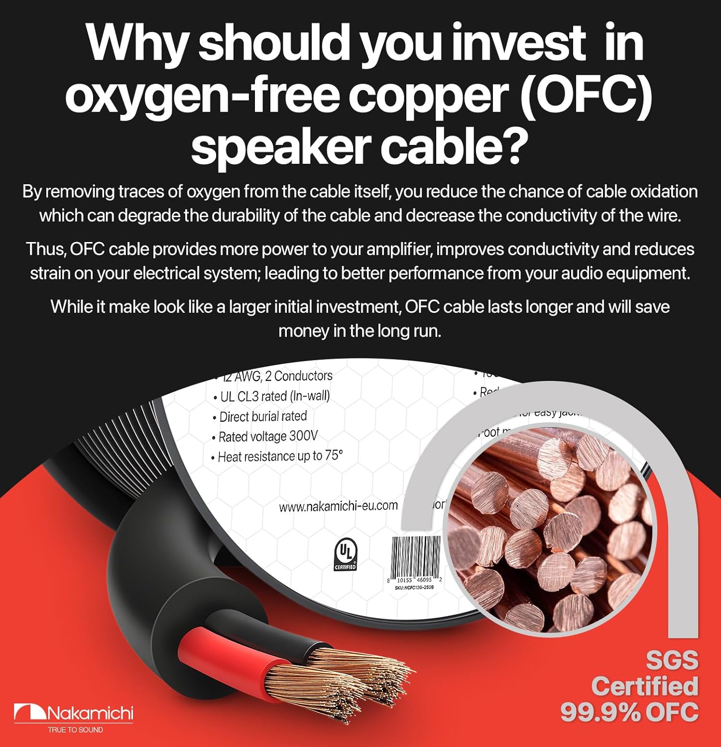 • ✅ Why should you invest in OFC cables? By removing traces of oxygen from the cable itself, you reduce the chance of cable oxidation, which can degrade the durability of the cable and decrease the wire's conductivity. Therefore, OFC cables provide more power to your amplifier, improve efficiency and reduce overall strain on your electrical system; all of which result in highest audio quality and performance from your audio equipment. While it may seem like a larger initial investment, Nakamichi CL3-rated OFC cables last longer and save money in the long run.