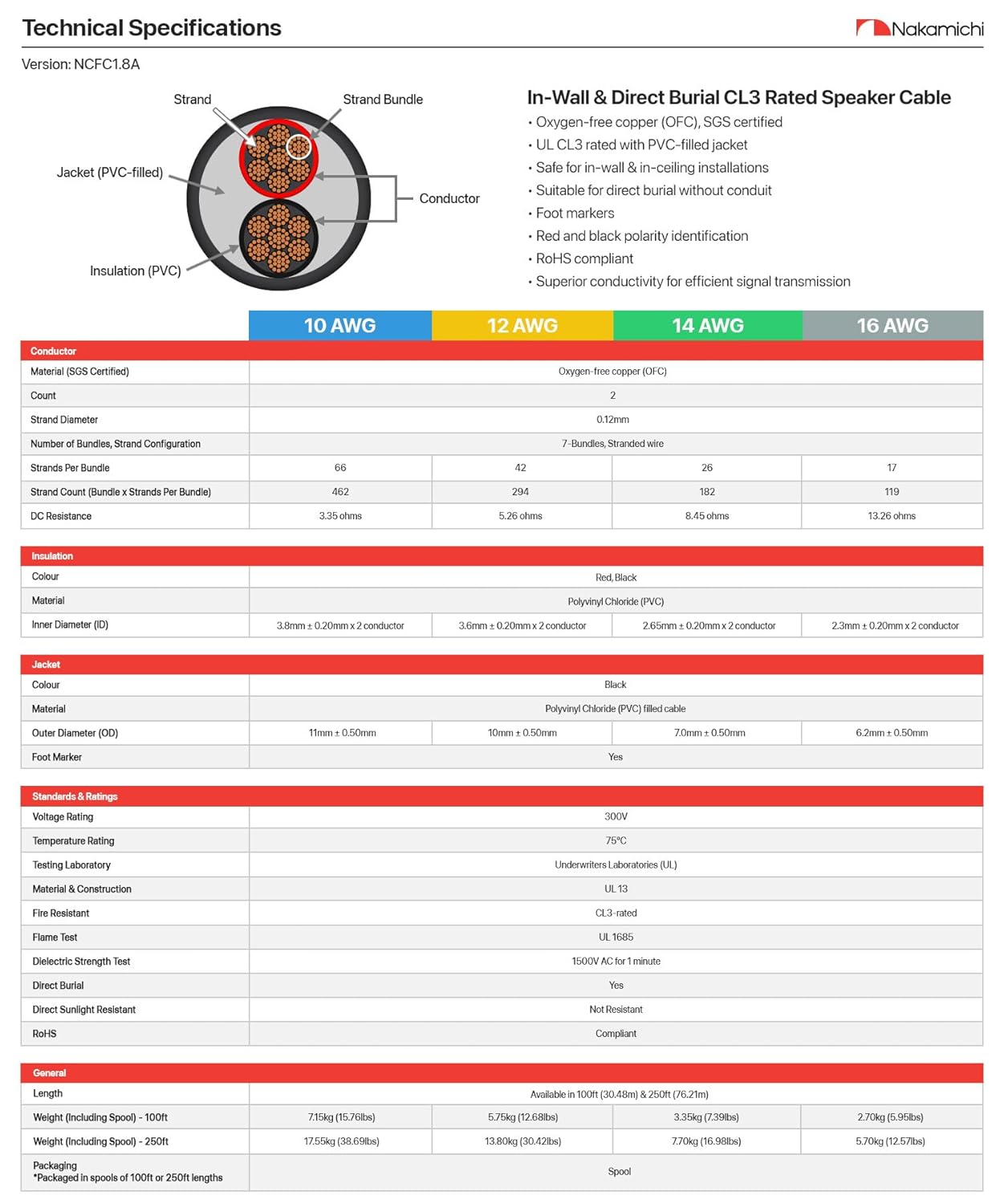 • ✅ Nakamichi CL3 rated (UL certified) in-wall & direct burial oxygen-free copper (OFC) speaker cables are designed for both outdoor, in-wall and in-ceiling installations, meeting fire-resistance standards for both residential and commercial spaces. The heavy duty PVC-filled outer jacket makes it ideal for personal projects, home theatres, commercial audio systems, conference rooms, and entertainment venues. Additionally, its direct burial rating allows for underground installation without the need for conduit.