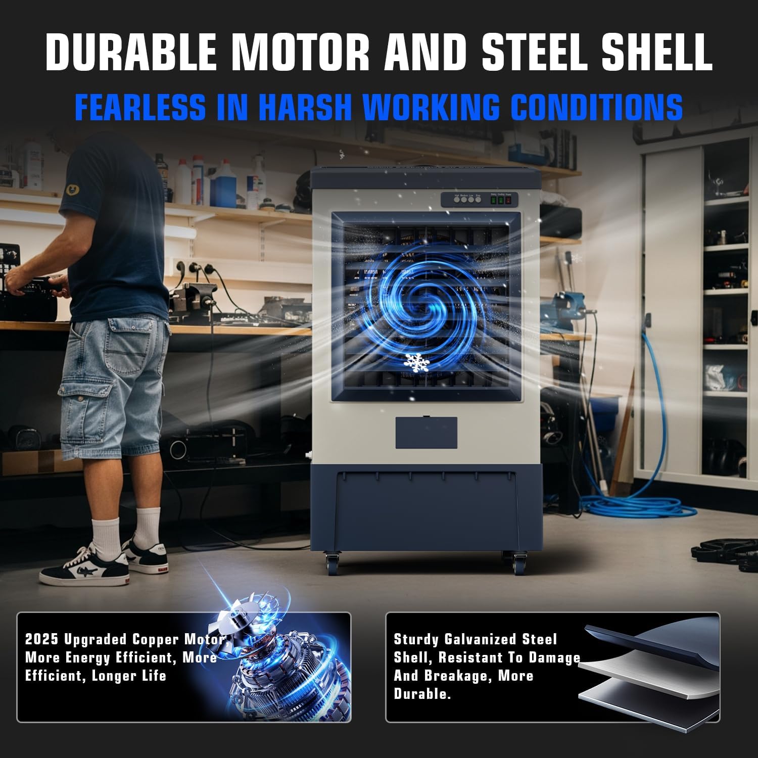 | Additional Features | 6500CFM Air Volume,1600 sq.ft Max Room Size, 19-Gal Large Water Tank,5 Ice Boxes, 3 Speeds,120° Oscillation, Manual & Auto Continuous Fill |