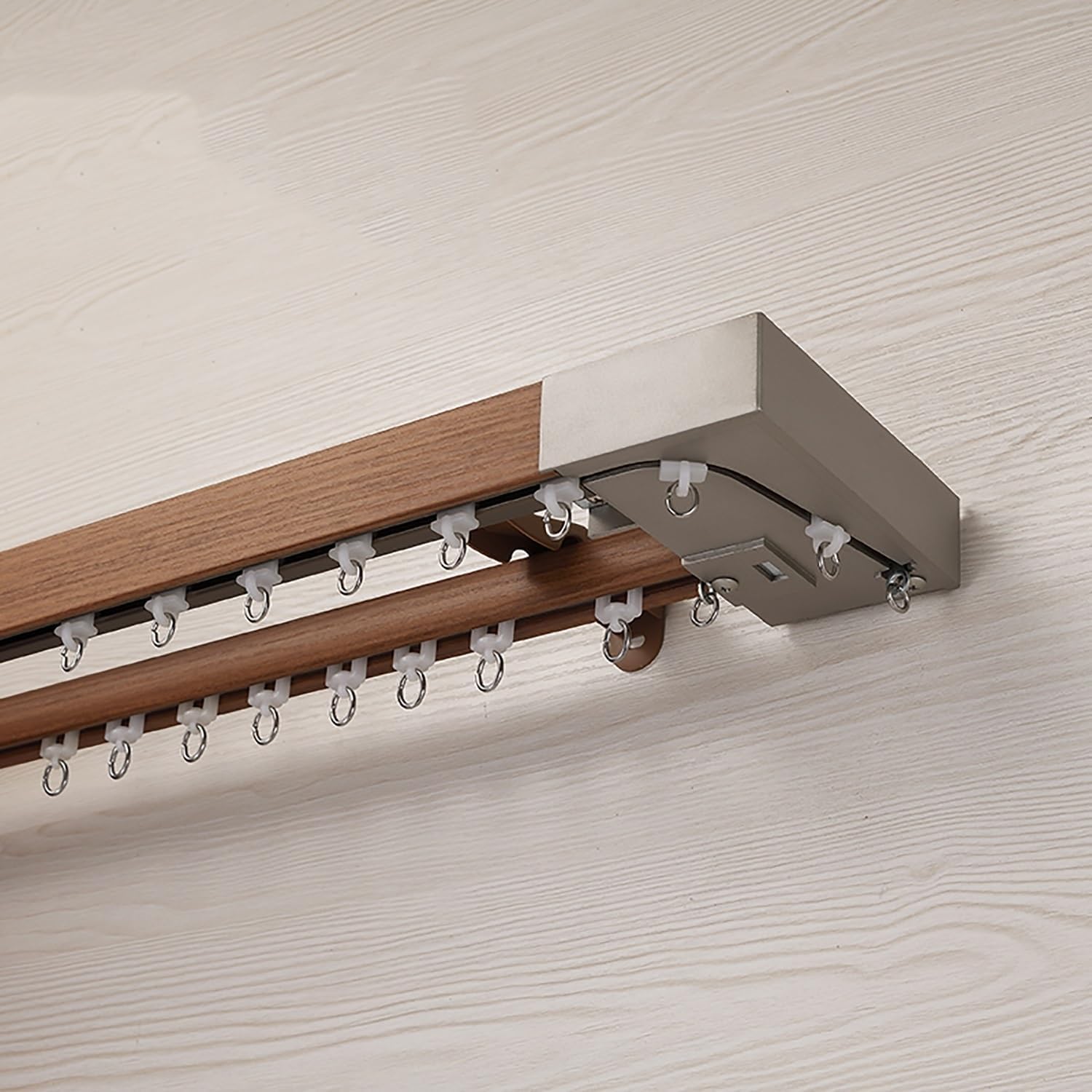 Name:Curtain track double railMaterial:AluminumType:Straight railColor: white pine wood color, green pine wood color (beige), teak wood color (brass), dark walnut color (brown)Seal material: plasticProcess: ElectrophoresisInstallation: top mountedHanging way: hook typeScene: living room, bedroom, bathroom, shower room, hotel, hospital, RVPackage Includes1 × Curtain track kit (including curtain track, pulley, end cap and other hardware kit)Features.Multi-layer refined, sturdy and durable, no rust, no color fading.With silent pulleys and metal hooks, no noise, all rollers can slide easily and freely inside the track.Warm Tips:Due to the limitation of logistics length, the curtain track over the limitation length needs to be installed in sections, we have special curtain track connectors which can be used between the tracks and will not affect the curtain track, we will send the connectors to you in the package.About service---We want you to be satisfied with your purchase, if you have any questions about the service, please contact us.About Color---Due to different camera settings, shooting light, computer and other factors, the actual color may be different from the picture, please prevail in kind, but not a quality problem!About the size --- Manual measurement data may have a little deviation, there may be 1~2cm deviation, please prevail in kind, please understand.
