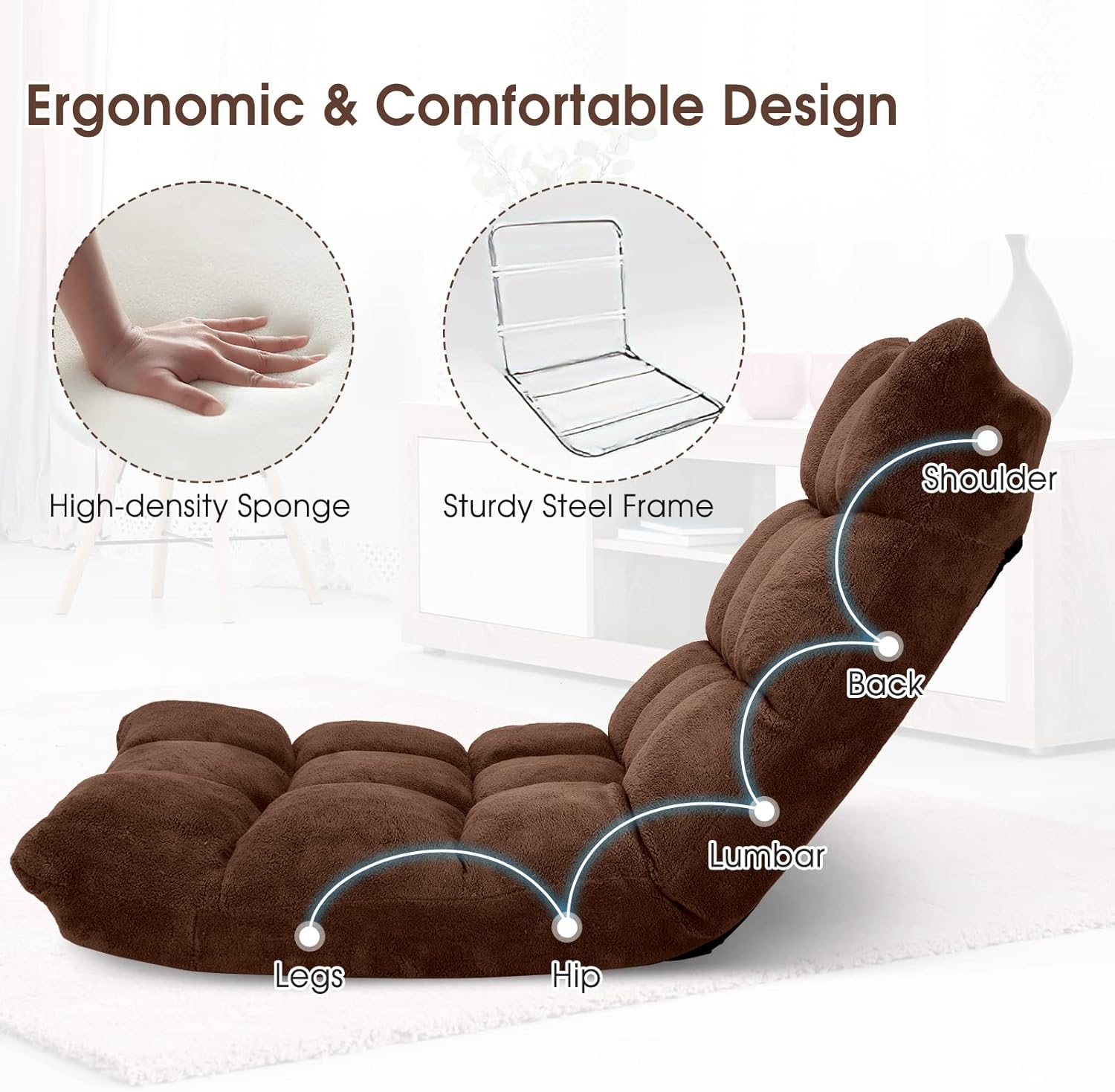 Description:The floor chair is comfortable and practical, whether you’re sitting and lying down in your living room or even in the office. As the backrest can be adjusted up to an angle of 180 degrees, the floor chair is both a recliner and the chair. With its adjustable backrest, it helps to prevent the back from unhealthy curving as well as uncomfortable back posture, thus helping to provide a comfortable experience and offer relief from long-time sitting. Filled with high density sponge, the chair offers soft and lasting support for your back. The frame that is made of alloy steel pipe is extremely durable, which is reliable and designed for long-term use. Additionally, its modern design and stylish appearance make it match your house perfectly, adding extra elegance and fashion.Features:Covered with coral fleece, the floor chair is a soft and comfortable to sitIts alloy steel frame is durable and stable, designed to withstand daily useFilled with high density sponge, the chair offers lasting and soft supportMade of totally nontoxic material. The chair is also suitable for childrenAdjustable back with 14 positions offers comfortable position and angleWith wide applications, the floor chair is multi-purposeFeaturing modern design, it also serves as a decoration to your houseSpecifications:Color: Beige/Brown/Grey/Black/Pink/PurpleMaterial: Sponge+Alloy Steel Pipe+FlannelNet Weight: 15lbsOverall Dimension: 40”x20”x5” (L x W x H)Weight Capacity: 200 lbsPackage includes:1 X Floor Chair1 X User Guide