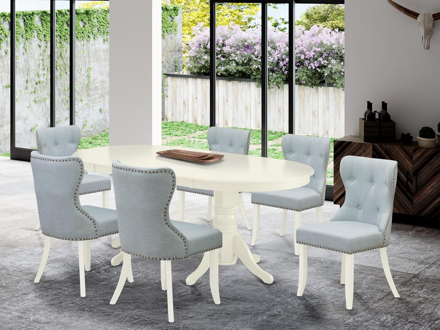 EAST WEST FURNITURE - VASI7-LWH-15 - DINING ROOM SETThis meticulously designed kitchen table set consists of a rectangular table and 6 upholstered dining chairs, accommodating up to 6 individuals. Tailored for compact kitchen or dining spaces, this wooden dining ensemble is an excellent choice for such settings. It combines comfort and sophistication, featuring plush Baby Blue Linen Fabric chairs matched with a high-quality Linen White finish on the wooden frames and a stunning double pedestal butterfly leaf oval dining table. This elegant color combination elevates your kitchen's aesthetics. Constructed from Premium Quality Asian wood (Rubber Wood), the unique parson chairs and double oval kitchen table offer remarkable sturdiness and stability. The set creates a cozy dining atmosphere with premium Linen Fabric upholstery for the Parson dining chairs. The table's dual pedestal legs and oval tabletop add sophistication to your dining space. This modern dining table set is lightweight, easy to move, clean, assemble, and fits seamlessly with any home decor. The smooth Linen Fabric seats and stylish chair backs ensure comfort during meals.PRODUCT FEATURES:Chair Leg Wood Color: Linen WhiteChair Fabric Material: Linen Chair FabricFabric Color: Baby BlueDinner table color: Linen WhiteKitchen Dining Chairs Dimensions: Length: 21.5; Width: 19.5; Height: 35.5.Wooden Table Dimensions: Length: 76.3/59; Width: 40; Height: 30.Package includes: 6 Parson Chairs and an Oval Kitchen Table.