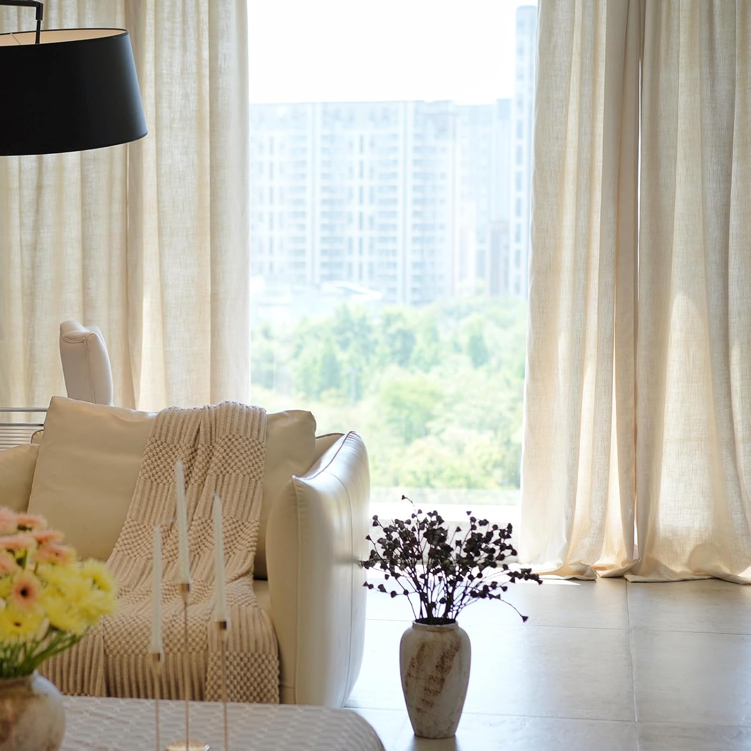 These heavyweight linen curtains with grommets provide warmth and style for any room. Crafted from durable linen with a textured weave, they filter light beautifully and have the lived-in charm of natural fabrics. Hammered grommets allow easy installation with rods. Their generous length ensures full coverage over windows while their relaxed drape lends an airy feel. Washing gently in cold water keeps them soft over time. Available in a versatile beige hue, they complement any interior and enhance the atmosphere of living rooms, bedrooms, dining areas or kitchens with their warmth and subtle texture. Measuring 52 inches wide by 84 inches long, they are ideal for standard window sizes.