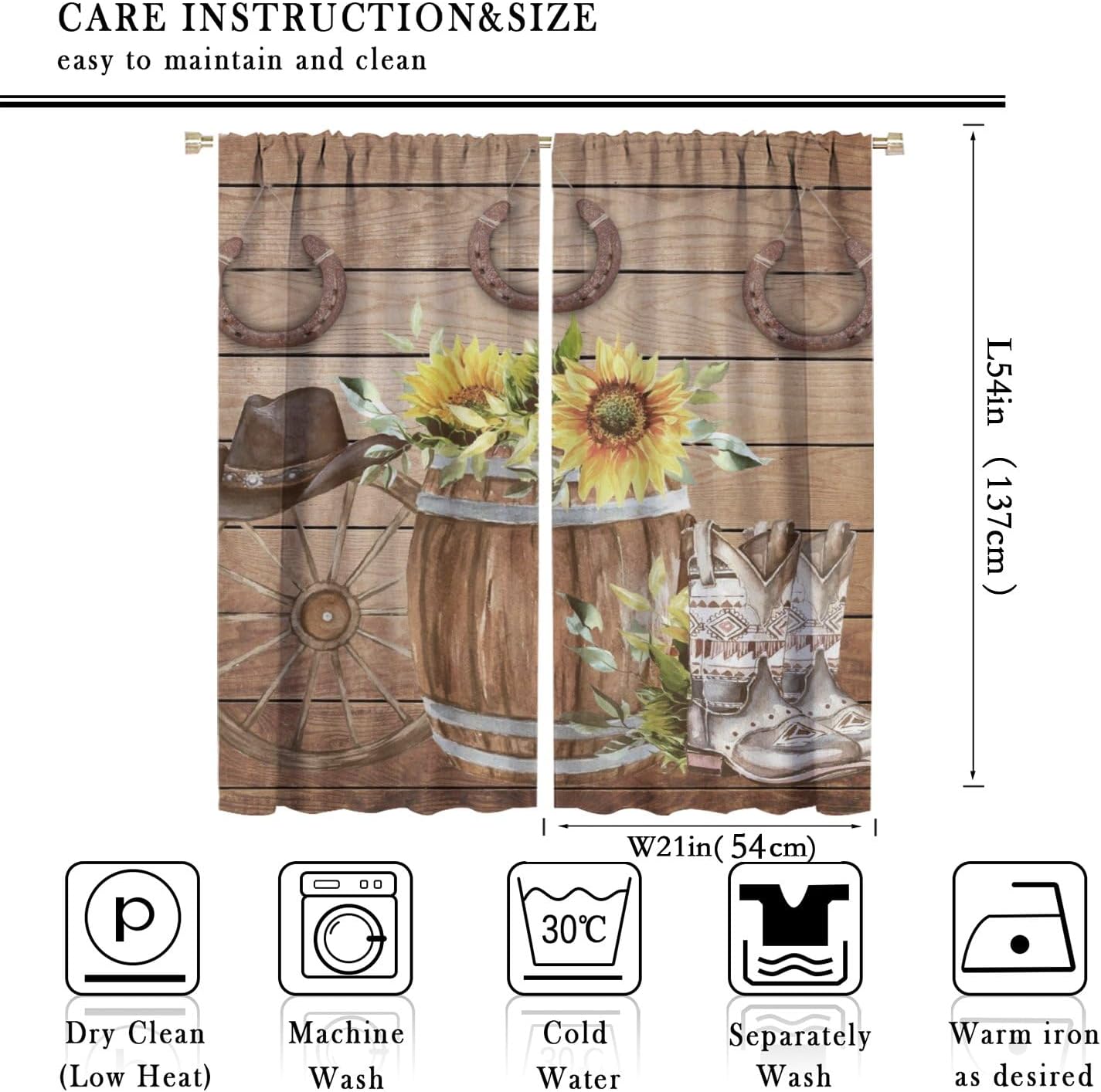 brebasf Rustic Animal Horseshoe Patterned Blackout Curtains Comes in eight sizes: Total size: 45" L × 42" W (114cm × 107cm),Includes two pieces, each of which measures:45" length × 21" width (114cm × 53.5cm). Total size: 54" L × 42" W (137cm × 107cm),Includes two pieces, each of which measures:54" length × 21" width (68.5cm × 53.5cm). Total size: 63" L × 42" W (160cm × 107cm),Includes two pieces, each of which measures:63" length × 21" width (160cm × 53.5cm). Total size: 63" L × 55" W (160cm × 140cm),Includes two pieces, each of which measures:63" length × 27.5" width (160cm × 70cm). Total size: 63" L × 63" W (160cm × 160cm),Includes two pieces, each of which measures:63" length × 31.5" width (160cm × 80cm). Total size: 72" L × 63" W (183cm × 160cm),Includes two pieces, each of which measures:72" length × 31.5" width (183cm × 80cm). Total size: 63" L × 72" W (160cm × 183cm),Includes two pieces, each of which measures:63" length × 36" width (160cm × 91.5cm). Total size: 84" L × 84" W (214cm × 214cm),Includes two pieces, each of which measures:84" length × 42" width (214cm × 107cm). This Retro Western Wooden Cowboy Boots Wheel Sunflowers Curtains liven up your indoor or outdoor spaces with a sense of airiness and beauty.Function: 1. Made of durable polyester fiber,soft and light. 2 The package includes: 2 panels. Curtain material: 98% polyester fiber. Provide a beautiful appearance for your bedroom,living room or office. 3. The curtains are grommet,which can be used with any standard curtain rods. Our products can be used as living,room curtains. Mother's Day,Christmas,Halloween,Thanksgiving,New Year's party decorations at home! We believe that you will like this curtain as much as we do. If you are not satisfied with our products,please contact us,we will solve any problems encountered by the products for you,so that you are satisf