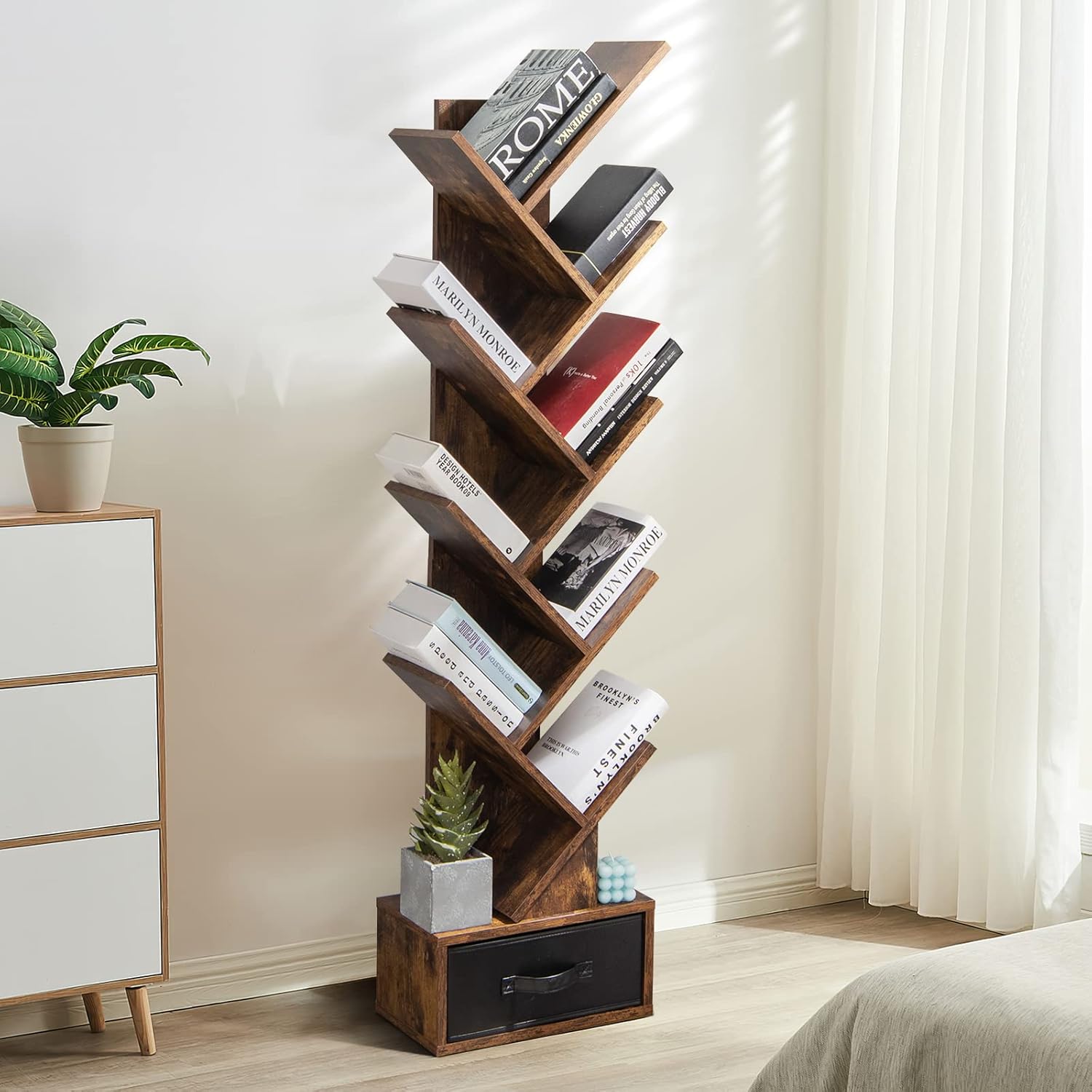 DescriptionIf you are tired of traditional bookcases and want to get something different, come and take a look at our tree bookshelf. The unique geometric design makes it not only a storage and display shelf, but also a decor in your room. 10 shelves and 1 drawer offers sufficient storage space both open and enclosed. High quality PB boards and anti-toppling devices behind ensures sturdiness and safety in your daily use. Whether to put it in the living room, study or bedroom, it would serve the purpose well. Just get one and make your room different!Features·Attractive geometric tree design·10 shelves and 1 drawer with ample storage·Slim tall size for space saving·Premium PB boards and wide base with sturdiness·Anti-toppling devices for safety use·Detail illustrated instruction easy to assemble·Smooth and waterproof surface easy to clean·Multifunctional shelf for storage and displaySpecificationMaterial: PB Engineered Wood, FabricOverall Dimension: 15’’ x 8.5’’ x 59’’ (W x D x H)Net Weight: 28.5 lbsPackage Includes:1 x Tree Bookshelf with Drawer1 x Instruction