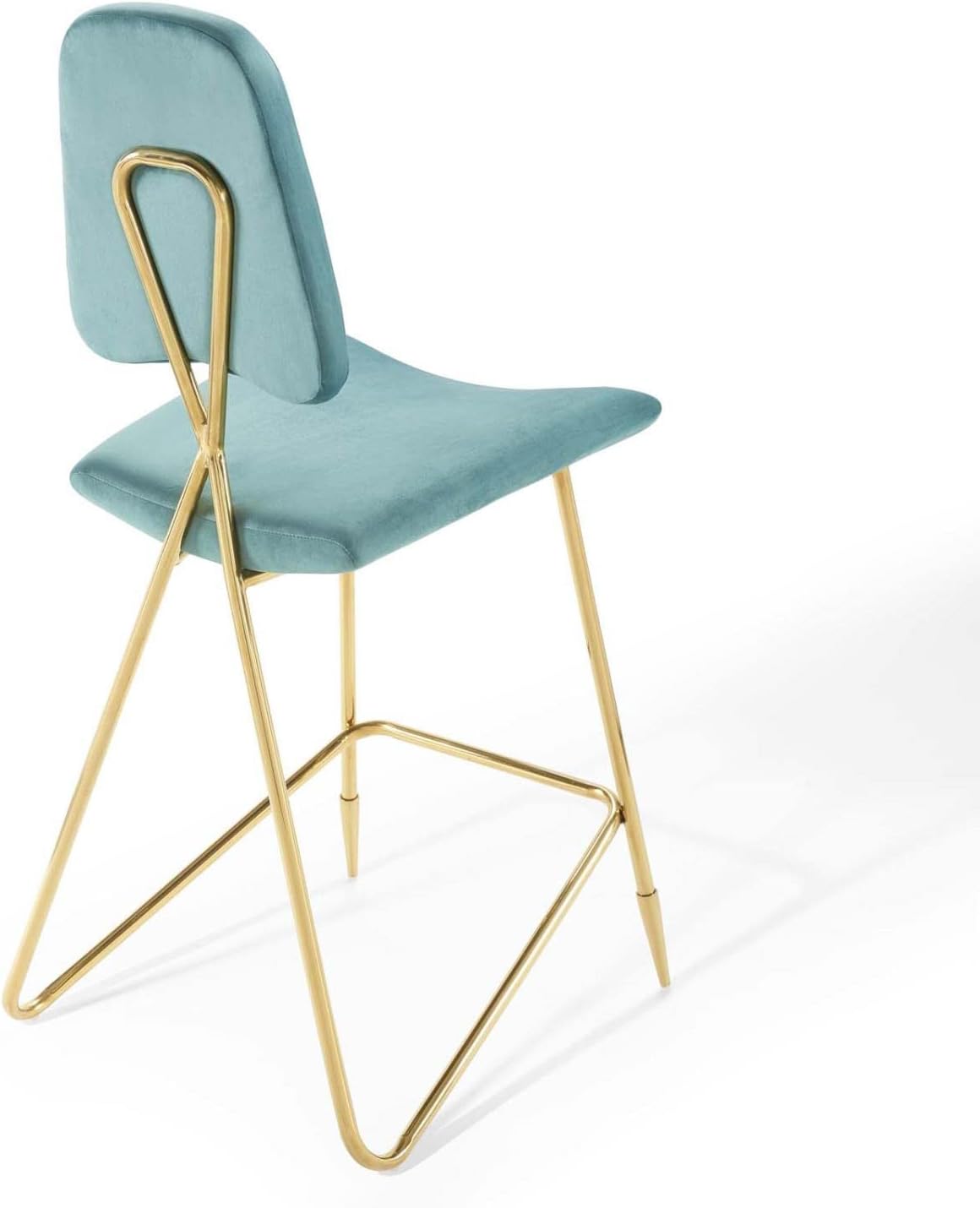 Survey your surroundings with confidence with the Ponder Upholstered Performance Velvet Dining Room Bar Stool. Ponder’s padded high-density foam seat gently slopes upward providing embracing comfort while the tapered back provides ergonomic support. Finely upholstered in stain-resistant performance velvet polyester, the Ponder Dining Stool makes a striking statement with its gold stainless steel base featuring two angled front mid-century legs and a rear tripod base. Accentuate your modern decor with a contemporary dining room bar stool that elevates any empty area of your home. Bar Stool Weight Capacity: 330 lbs.