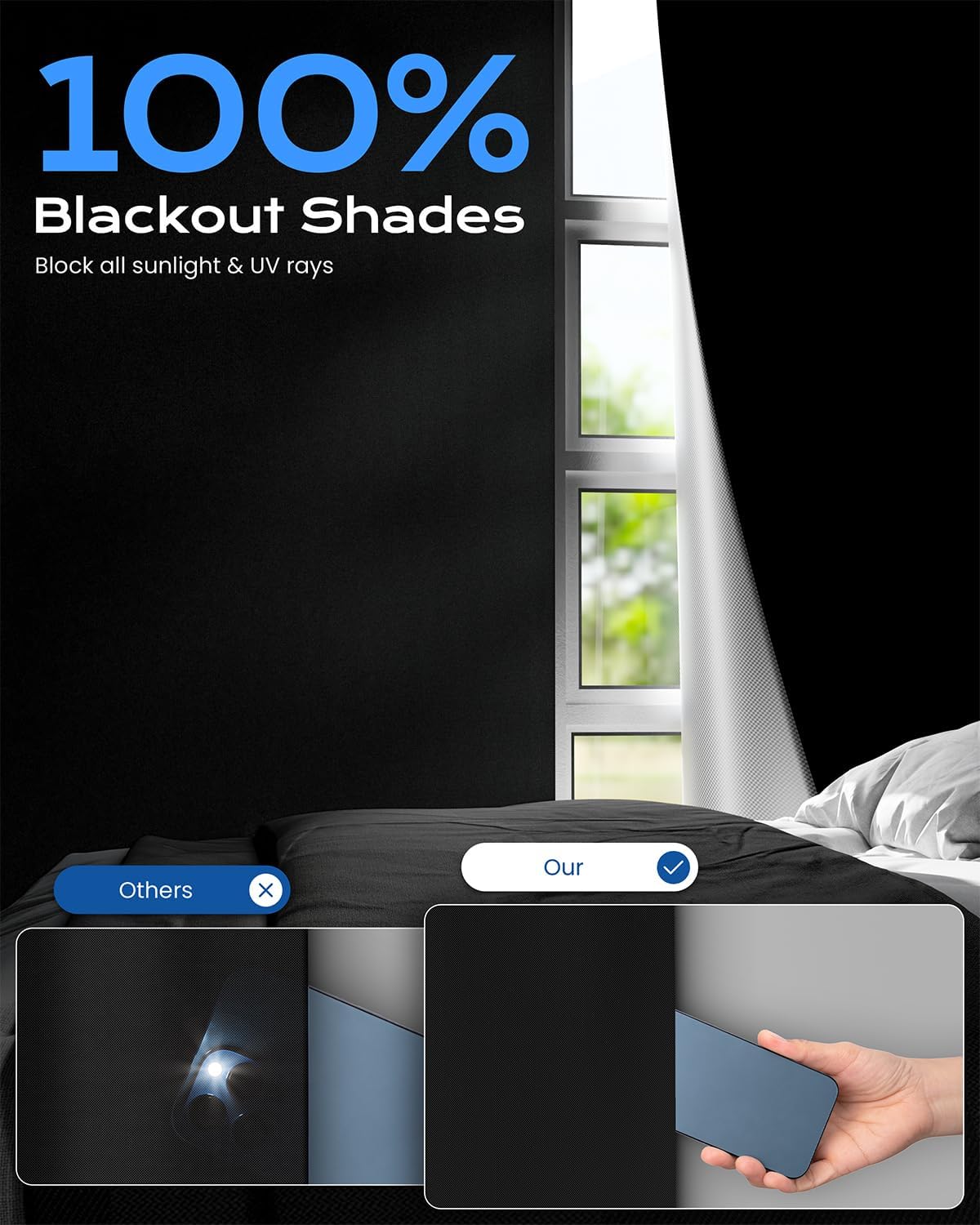 OTUOER Blackout Curtains: Sleep Improvement Made SimpleDon't let light disturb your sleep anymore. OTUOER's portable blackout curtains offer 100% blackout, thanks to their high-quality polyester material with a reflective silver layer. This not only blocks out light but also deflects UV rays and heat, creating an optimal sleep environment.Installing these shades is a breeze with our enhanced hook and loop fastener system—no tools, no drilling, just perfect fit. Maintenance is minimal with our durable, fade-resistant fabric. A quick machine wash and iron will keep your temporary blackout shades for windows looking fresh. Your purchase includes all necessary components: one blackout shade with hook and loop fasteners, two extra tape strips, each splittable into 5 squares, and an instruction manual for easy setup.For a better night's sleep and effortless window treatment, choose OTUOER window blackout cover. Contact our customer service for any assistance you may need.