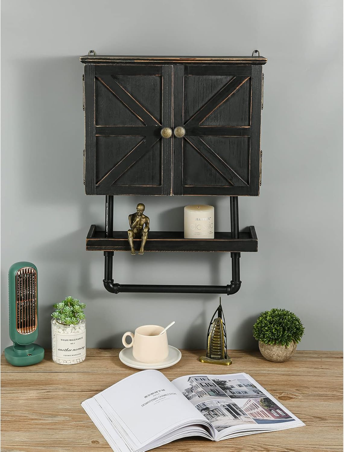 | Storage Options | shelves, doors, towel rack |