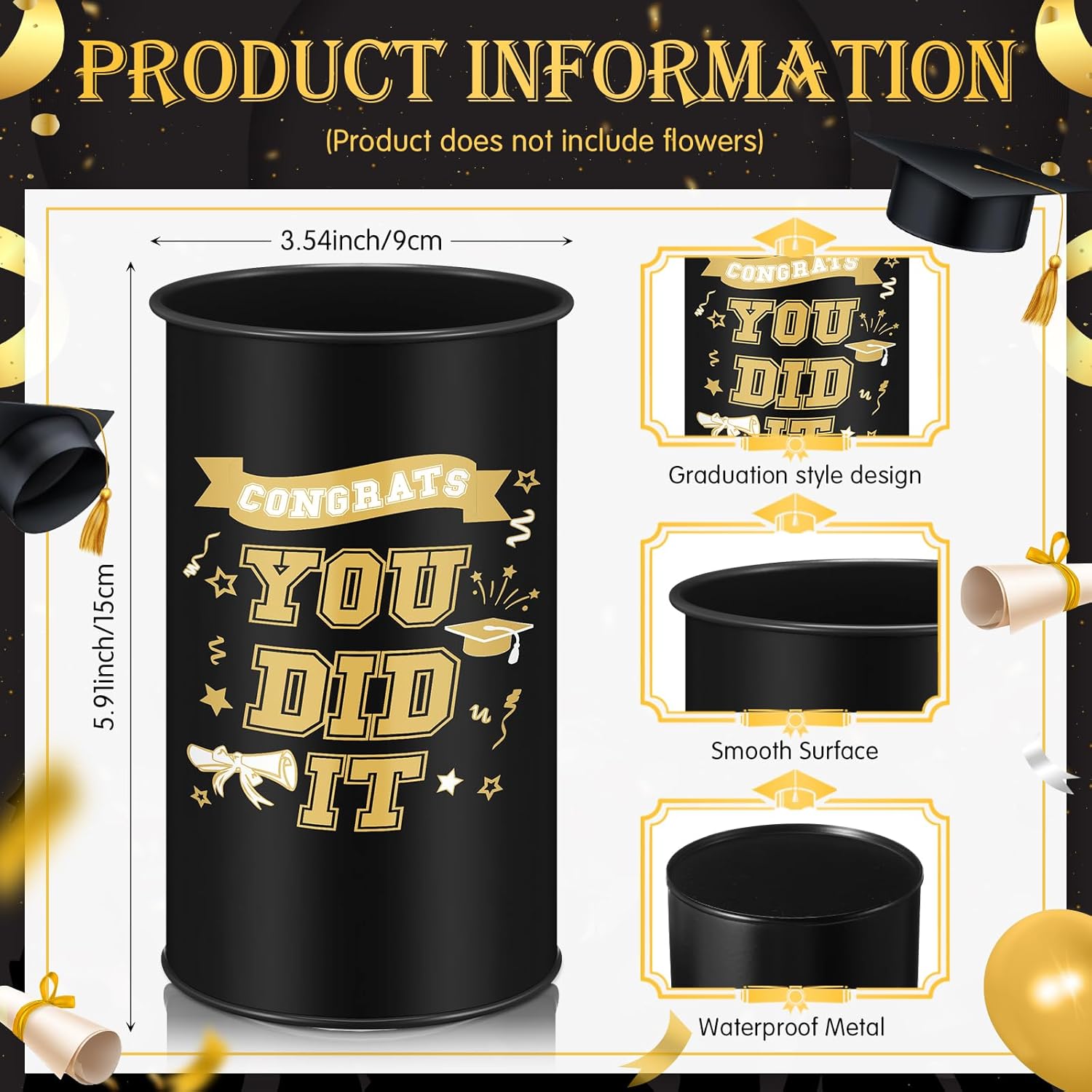 Features: In addition to their primary function as a vase, these decorations can also hold a variety of small gifts, inspiring your creativity in gift wrapping. You can put different candies, cookies, and even decorative bows in them, making them a flexible choice for graduation gift-giving occasions. These graduation vases are meaningful gifts that stand out for most occasion. Their delicate design adds a decorative touch to gift-giving, making them ideal for friends, loved ones, or anyone looking to upgrade their home decor. They are a thoughtful gesture that strengthens a personal connection and expresses affection. Specifications: Material: galvanized metal Color: main black Size: about 3.54 x 5.91 inches/ 9 x 15 cm (WxH ) Package includes: 12 x Vases Notes: Manual measurement, please allow slight errors on size. The color may exist a slight difference due to different screen displays