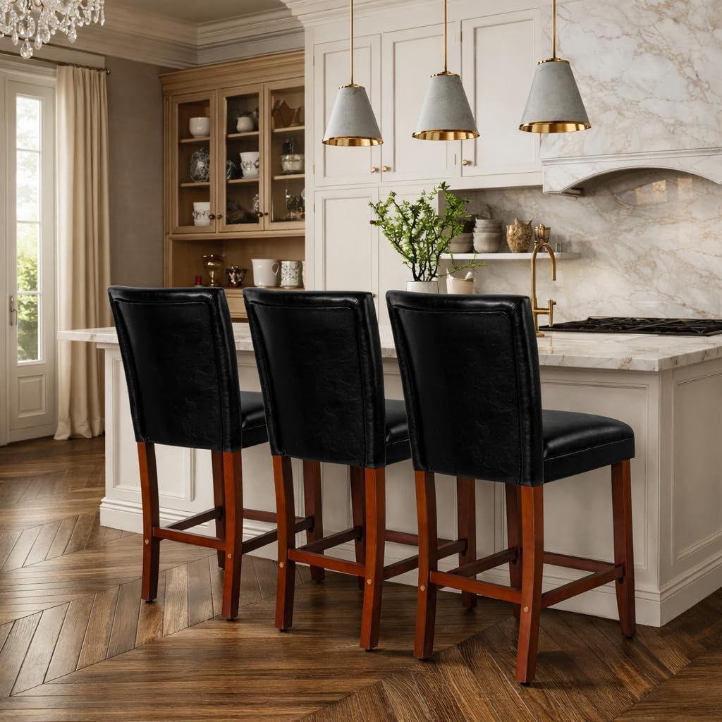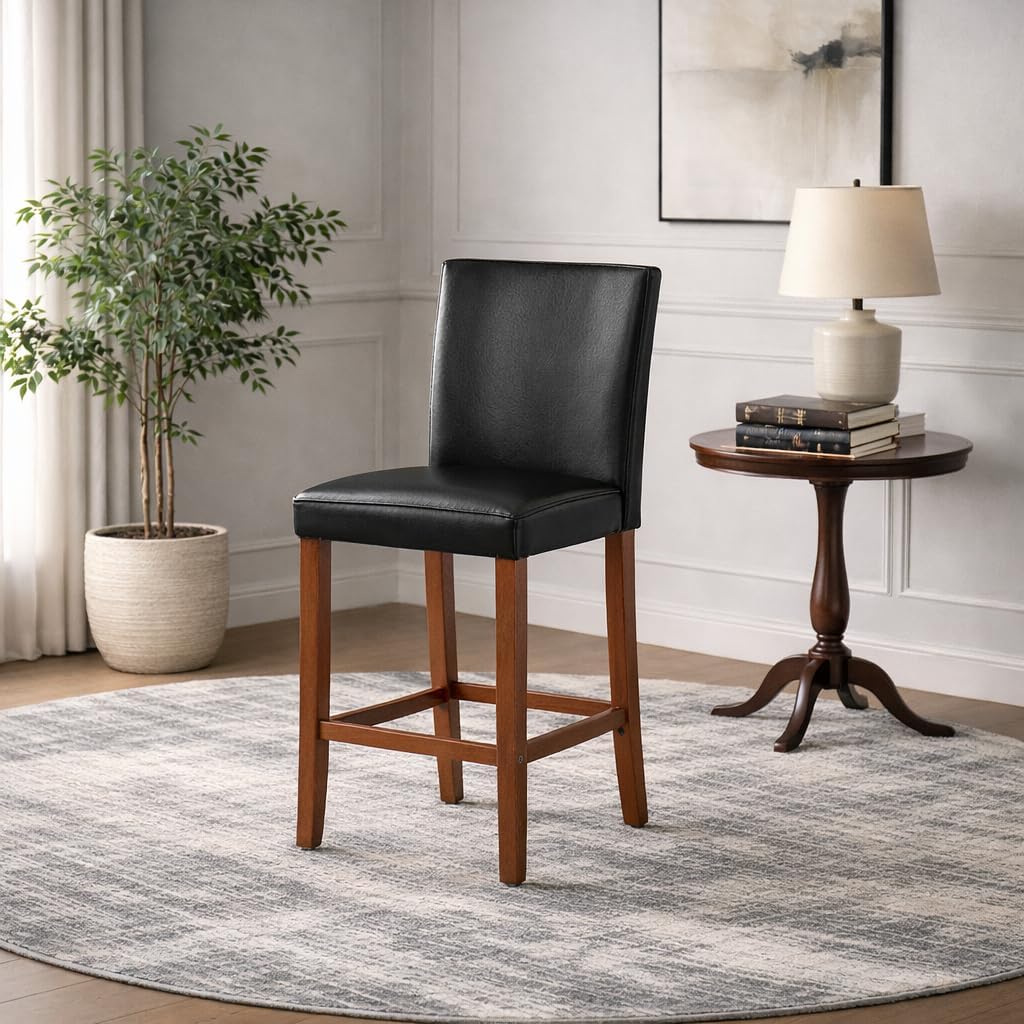 The most classic barstool design is offered in a black faux leather fabric with light cherry wood legs. This piece will be a lasting investment that is easy to assemble and clean. 29" seat Height makes this an ideal option for counter seating. Maximum weight capacity 250 lbs. Dimensions 19"Lx23.25"Wx43.50"H. Some assembly required.