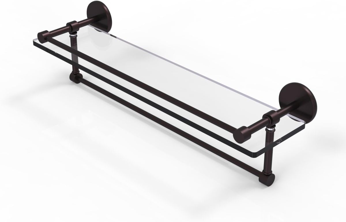 Add a flare of style to your decor with this decorative glass shelf. Shelf can be used anywhere in the home for a great space to store your products. Gallery rail will keep your items secure while the integrated towel bar provides a creative space for your towels. Tempered glass is 3/8 Inches thick and all of the hardware is made of solid brass and finished with the highest quality materials to provide a lifetime of beauty.