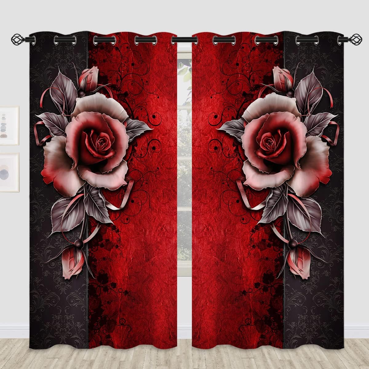 These print curtains are perfect for Living room, bedroom, kids room, kitchen, yard, patio, parlor, sliding door with Red Rose,Romantic Flower Valentine's Day Wedding pattern.- Unique design:· Save energy costs by insulating against heat and cold.· Reduce noises from busy streets and high-traffic areas.· Protect furniture from sun damage and fading.· Provides complete privacy when needed· Perfect for any bedroom, office kids room and living room.- Package Included:· Blackout window curtains 2 Pcs set ( two panels).- Material:· Our Blackout Curtain Liners are crafted from a durable soft and thick triple weaved blackout fabric which can block out sunlight and UV rays. The darker color of the fabric, the more light it can block.- Easy Care Instructions:· Machine washable in cold water· Do not bleach.· tumble dry on low· low temperature ironing- Notes:· For your curtains to be more perfect, please choose a size 5-10 Inch larger than the actual window width.· here may be slight differences in colors on different displays. If you have any questions about the product, please feel free to contact us.