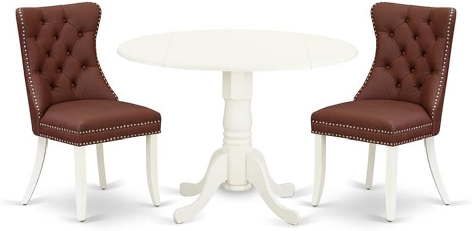 EAST WEST FURNITURE - DLDA3-WHI-23 - 3-PIECE MID CENTURY MODERN DINING SETIntroducing a charming and space-efficient 3-piece dining table set that adds both elegance and functionality to your dining area. Crafted from durable rubberwood and finished in a classic linen white, this set comprises a round kitchen table and two parson dining room chairs, promising both quality and aesthetic appeal. The round kitchen table serves as the centerpiece with its classic shape and a practical dropleaf tabletop extension. This ingenious design allows you to adjust the table's size to suit your dining needs, making it an excellent choice for smaller dining spaces. Supported by a graceful pedestal base, the table not only provides stability but also exudes a timeless charm. The two parsons dining chairs effortlessly combine style and comfort, upholstered in a rich Beige Red Polyester that adds warmth and luxury to your dining space. These chairs are thoughtfully adorned with nail head accents for a touch of refinement and feature chair pull handles for ease of use. Their curved front legs enhance their visual appeal and ensure stability. Engineered with an ergonomic sitting position, these chairs prioritize your comfort, allowing you and your guests to savor leisurely meals in style and relaxation. This dining room set not only enhances the visual charm of your dining space but also offers a comfortable and adaptable setting for all your dining occasions.DINING TABLE FEATURES: Material: RubberwoodShape: RoundTable Top Extension: DropleafBase: PedestalFinish: Linen WhiteDimensions: Length: 42; Width: 42; Height: 30DINING CHAIRS FEATURES: Chair Type: Parson ChairFrame Material: RubberwoodFinish: Linen WhitePolyester Type: PolyesterPolyester Color: Beige RedDimensions: Length: 19.5; Width: 24; Height: 38INCLUDES: A Round Dining Table and 2 Parson Chairs.