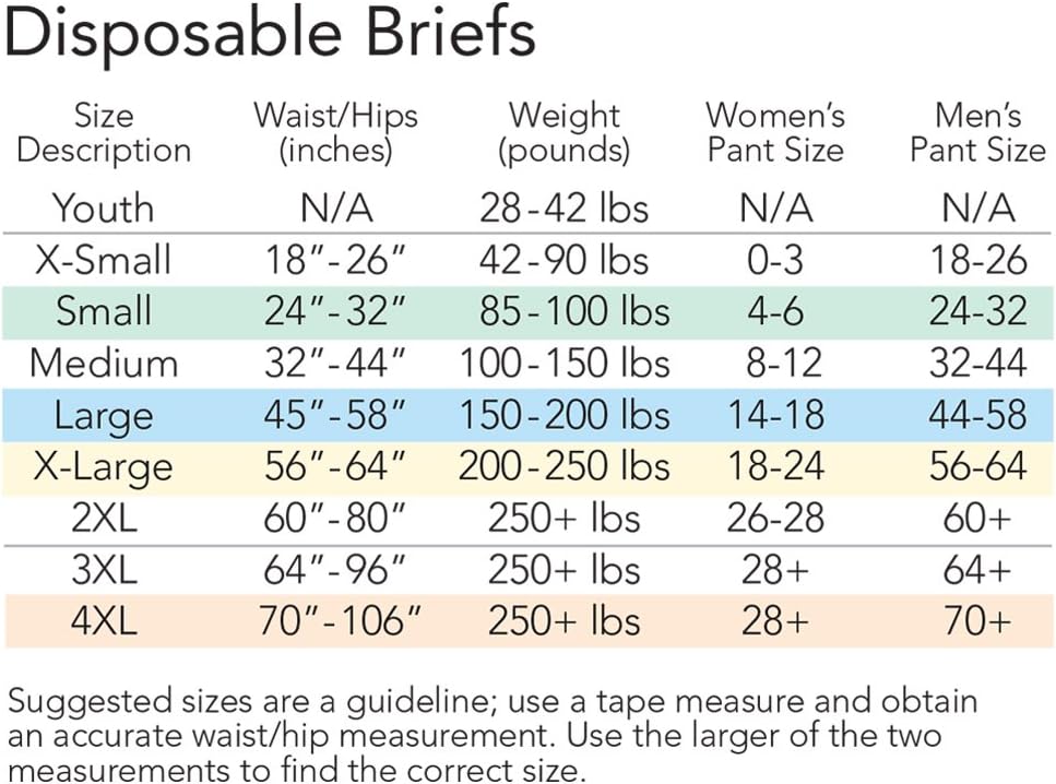 Tranquility SlimLine Original adult disposable briefs (also called adult disposable diapers) conform to the body for a comfortable fit while providing superior absorbency. The soft, cloth-like inside layer is gentle against your skin. The underlying, high-capacity, absorbent peach core contains superabsorbent polymers that guarantee skin dryness, odor reduction, urine pH neutralization, and inhibition of bacterial growth. The wetness indicator turns from yellow to blue when moisture is present, thus eliminating unnecessary changes and reducing costs. Kufguards (inner leg cuffs) channel fluids into the core, helping to contain high volume urge episodes and bowel incontinence (or fecal incontinence). The Youth, X-Small and Small disposable briefs feature a cloth-like backing and micro-hook closure tabs with finger lift tips that grip the soft cloth securely but still allow for multiple openings of the brief. The Medium, Large and X-Large disposable briefs have poly backing with refastenable tape tabs that also allow for multiple openings of the brief. Available in six sizes (Youth, X-Small, Small, Medium, Large, and X-Large). Latex-free.