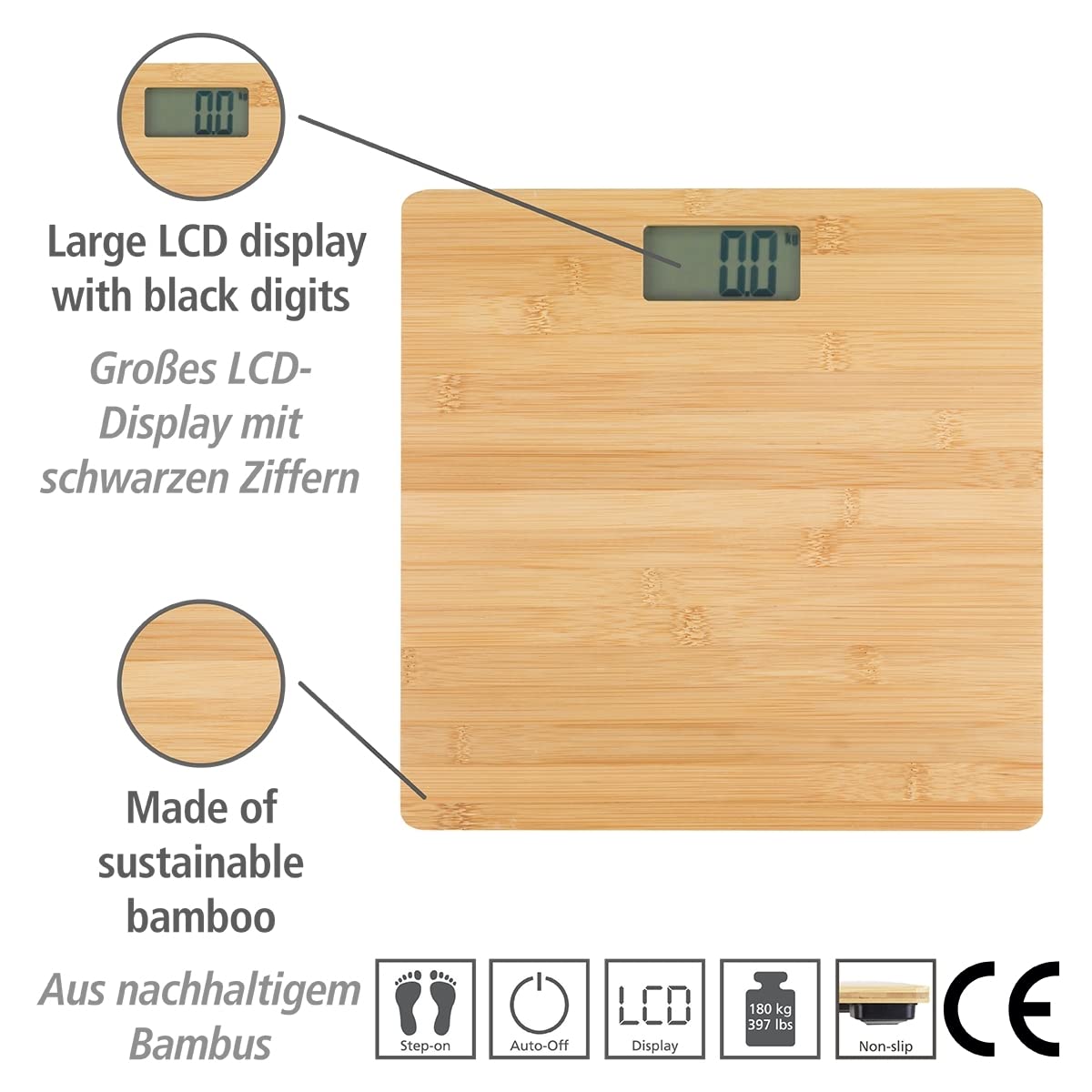 With the Bamba bathroom series from Wenko made of lightweight and sturdy bamboo, you can design your own wellness oasis. The renewable raw material from which the beautiful bathroom accessories are made gives your bathroom a warm and natural ambience. The Bamba personal scales from Wenko impress with a great design, high-quality workmanship and a pleasantly natural look. The surface of the weighing device is made of high-quality bamboo, which is hard and durable. Even under ecological aspects, the material offers clear advantages: bamboo is a rapidly renewable raw material and is absolutely on trend thanks to its naturalness. Measuring 30 x 2.7 x 30 cm, the scale can be flexibly positioned - either open or elegantly hidden under a bathroom cabinet that has enough room to the floor. Due to its flat design, the body scales disappear in small niches or between two cabinets. It also ensures a comfortable stand, as bamboo is pleasantly warm compared to other materials such as glass or metal. The easy to clean bamboo tread is equipped with a large LCD display. The display size is 7.3 x 3.5 cm - a good representation of the numbers shown in black is thus secured. The measuring range of the weight determination device is displayed in 100 g increments and ends at 180 kg. The weight scale is also battery operated. Manual switching on before use is not required, after use, the bamboo scale automatically turns off again. This makes it energy-saving and ideal for a long service life. The corresponding batteries (2 x AAA) are included. Especially practical: each element of the Bamba bathroom series by Wenko can be perfectly combined with each other. The accompanying furniture and bathroom accessories from the bamboo theme world are therefore essential for sustainable bathroom design. Material: bamboo Colour: natural. Dimensions (W x H x D): 30 cm x 2.7 cm x 30 cm Net weight: 1340g