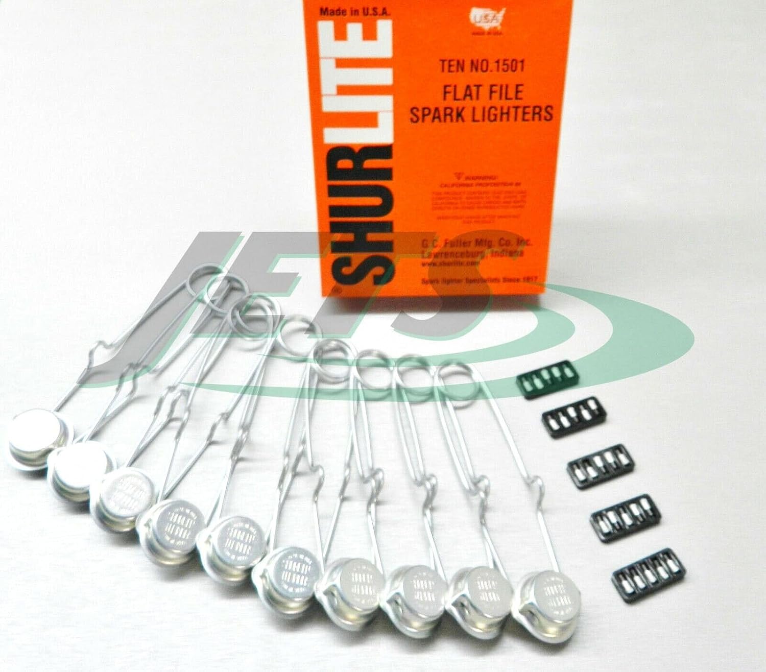 🟢 10 Spark Lighters and 25 Flints 🟢 Striker for Torch - Ignitor 🟢 Shurlite 10 Spark Lighters and Renewal 25-Flints (5 Packs Of 5) 🟢 Universal Round File Lighter, spark lighter. Designed for the welding industry, #1501 is capable of lighting any flammable gas. 🟢 The Spark Lighter features a very long lifespan and provides the lowest cost per ignition of any lighter anywhere. This lighter is guaranteed to spark vigorously and reliably. This is the ideal lighter for professionals. The spark lighters flint tip may be easily replaced with Single Flint Renewals (included). 🟢 The #1501 features a round file, a large hood for trapping flammable gases for easy ignition, and a wire frame made from specialty steel that retains its springiness over the life of the lighter. 🟢 Every lighter is tested by a human being prior to shipment for guaranteed quality. 🟢 You get the 10 Spark Lighters along with 25 Flint Renewals (Renewal Flints in 5 plastic holders) 🔸 Made in USA 🔻 JETS Product # 2004-110 x10+2004-120x5 🔻