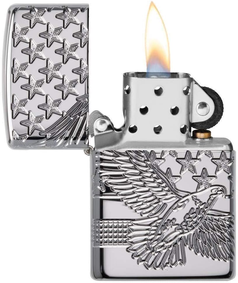 Our eagle lighter collection were created as an American symbol that display the icon of our nation. The eagle collection includes various imprint methods such as color imaging, engraving, deep carve and emblem attachments. Base model finishes include; Black Ice, High Polish Blue, Brushed Brass, Brushed Chrome, High Polish Chrome, Street Chrome and White Matte. Each lighter has a bottom stamp signifying the year it was made, is refillable, and is backed by Zippo's lifetime guarantee. All windproof lighters are American made in our Bradford, PA factory and come packaged in a gift box.