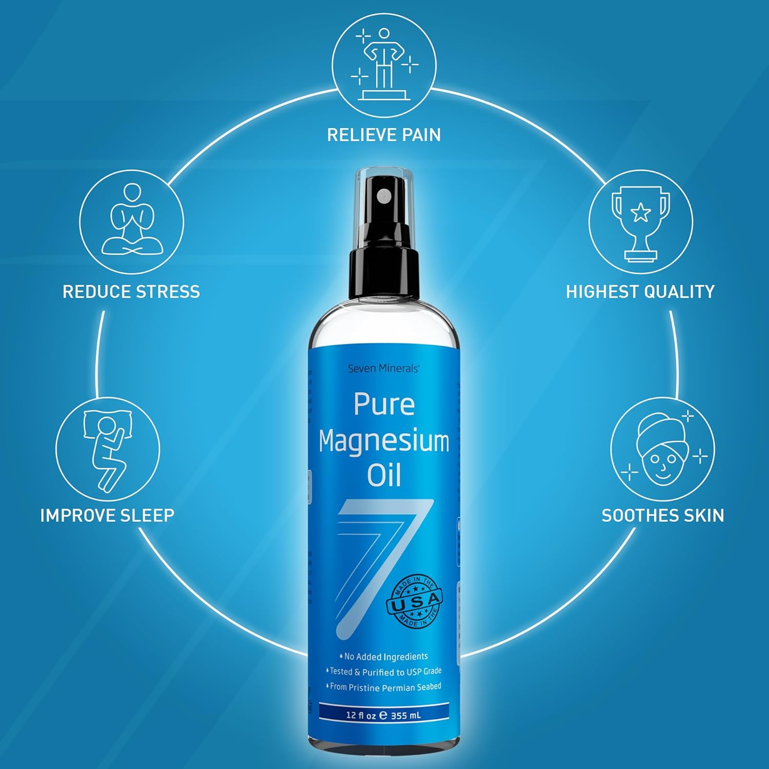 This bundle contains (1) 12oz bottle of Seven Minerals Pure Magnesium Oil and (1) 8oz bottle of Seven Minerals Soothing Relief Magnesium Lotion
