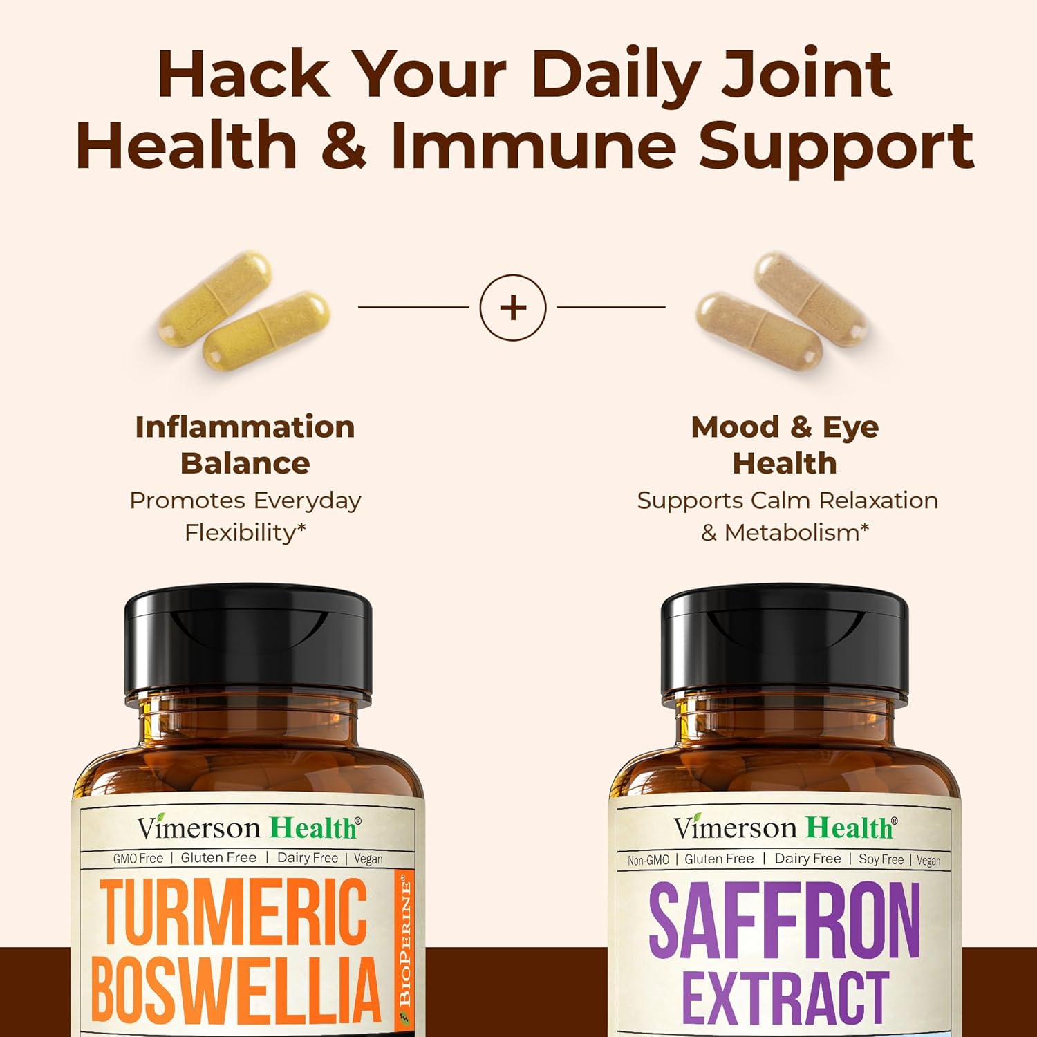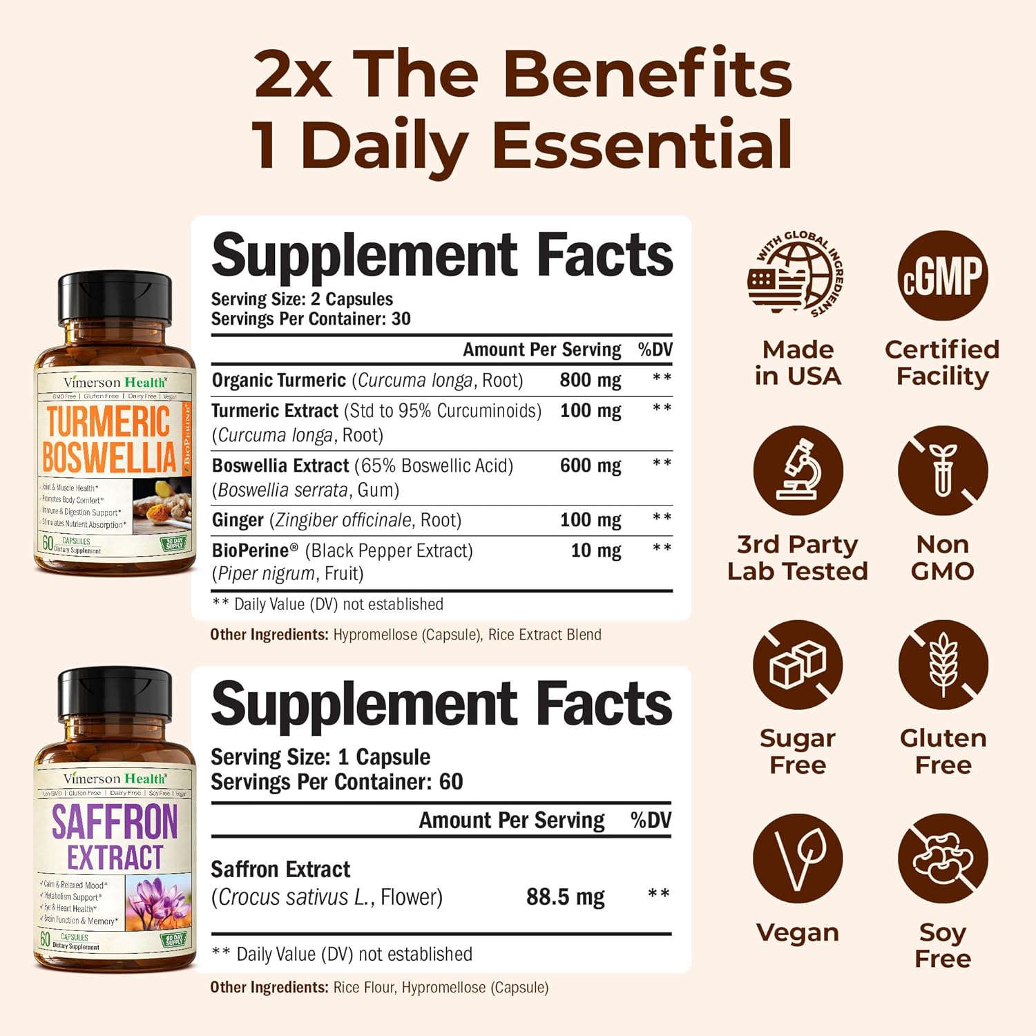 Experience a powerful 2-in-1 formula that supports joint health, emotional balance, and daily vitality — the Turmeric Boswellia + Saffron Extract bundle combines two time-tested natural ingredients for full-body wellness. This advanced pairing merges the strength of a turmeric curcumin supplement and boswellia extract capsules with the mood-enhancing benefits of saffron supplements, creating a perfect balance of comfort and calm.* Each serving of Turmeric Boswellia provides organic turmeric, turmeric extract (95% curcuminoids), boswellia serrata, ginger root, and black pepper (BioPerine) for enhanced absorption and effectiveness. These ingredients work together to support mobility, flexibility, and digestive comfort while promoting a healthy inflammatory response. The Saffron Extract supplement features pure saffron (Crocus Sativus L.) — a premium pure saffron supplement known for its ability to promote positive mood, focus, and emotional well-being.* Ideal for adults seeking both joint support and mood support supplement benefits, this bundle brings together curcumin with black pepper for absorption and saffron extract supplements standardized for potency and purity. Whether you know it as saffron extract, safron, azafran, or affron saffron, this high-quality formula helps balance mood, reduce everyday stress, and support relaxation — making it one of the most trusted saffron supplements for women and men alike.* With turmeric and ginger supplements supporting joint flexibility and saffron capsules enhancing emotional wellness, this daily bundle helps you feel balanced, active, and at ease.* Rediscover comfort and calm with the Turmeric Boswellia + Saffron Extract bundle — your complete solution for joint comfort, stress relief, and natural mood balance with trusted, plant-based ingredients.*