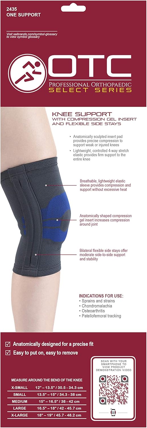 Product Description The OTC 2435 knee support with compression gel insert and flexible stays features anatomically contoured compression gel insert pads to provide targeted, precise compression to support weak or injured soft tissue around the joint. The elastic fabric material is lightweight and breathable with a four-way stretch that molds around the bony prominences of the joint. The Compression gel inserts support natural motion in the joint and provides for an optimum fit. Manufacturer Contact Information CINCINNATI, OH, 45209 US