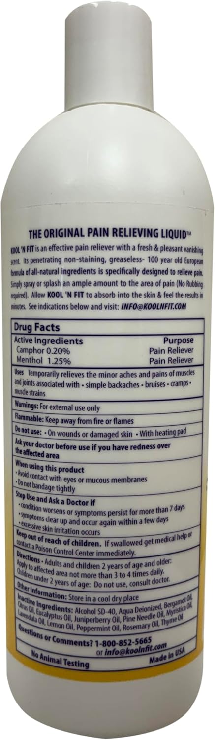Kool N Fit is enriched with natural ingredients and essential oils renowned for their pain-relieving properties. Crafted with a blend of SD-40 Alcohol, De-Ionized Water, Menthol, Camphor, Pine Oil, Eucalyptus Oil, and other essential oils, each component is sourced from the USA. Kool N Fit stands as an all-in-one solution for various types of discomfort such as back pain, foot pain, knee pain, and joint pain. Its formula is enriched with natural ingredients and essential oils. With soothing blend of menthol and camphor.Simply apply, let dry and you are ready to go. Leaving no greasy or staining residue behind.Manufactured in the USA with natural ingredients, Kool N Fit is a trusted companion on your journey to well-being.